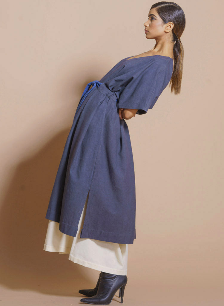 A Kaftan style midi dress featuring a deep neck, quilted belt and side slits. Length 44", Chest 88", Shoulder 36". The model is 5'8" and is wearing a free size.