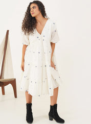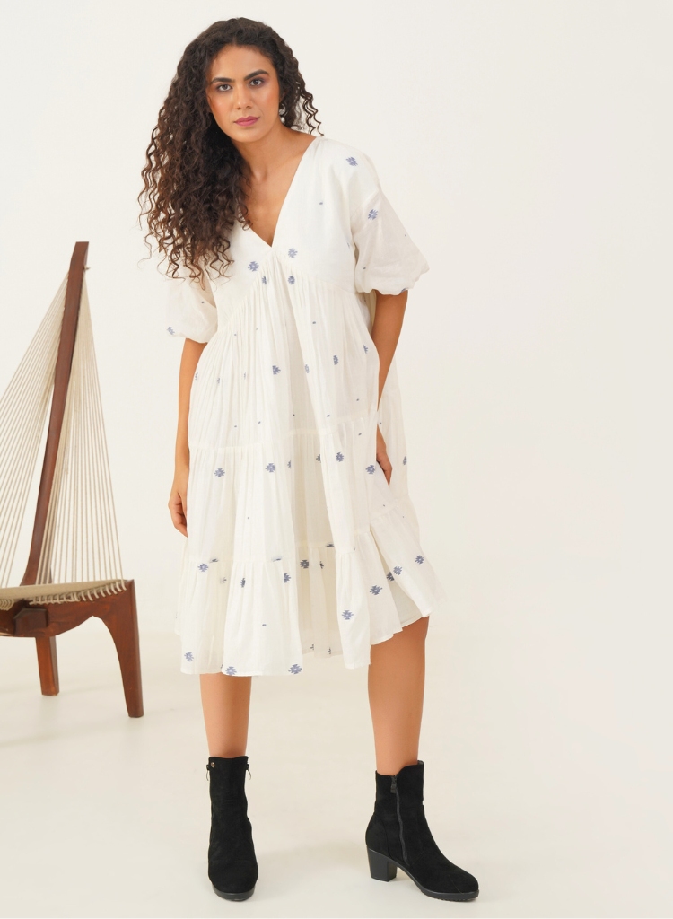 A timeless Jamdani dress designed with comfort and effortless movement in mind. This versatile piece showcases a plunging V-neckline, relaxed drop shoulders, and airy bubble sleeves that create a beautiful sense of flow. Delicate gathers add a playful touch of volume, making this dress a perfect blend of elegance and ease. Length 42". The model is 5'8" and is wearing size S.