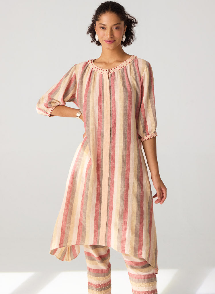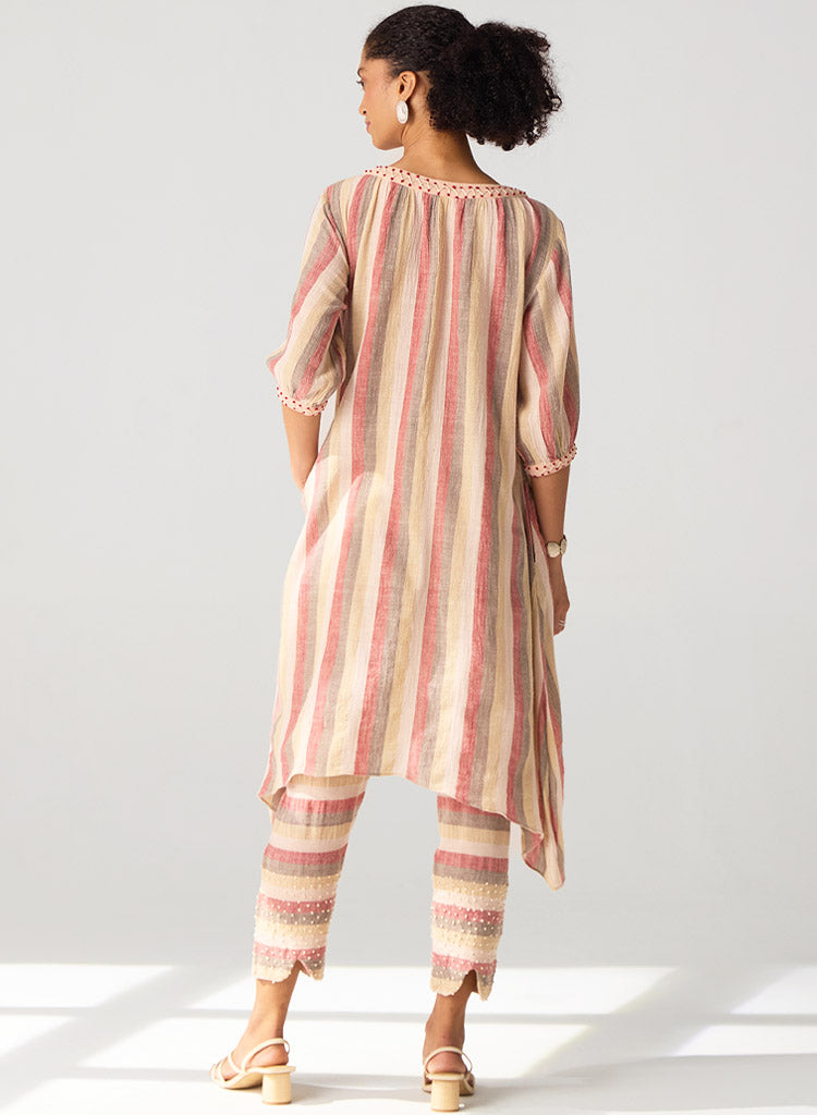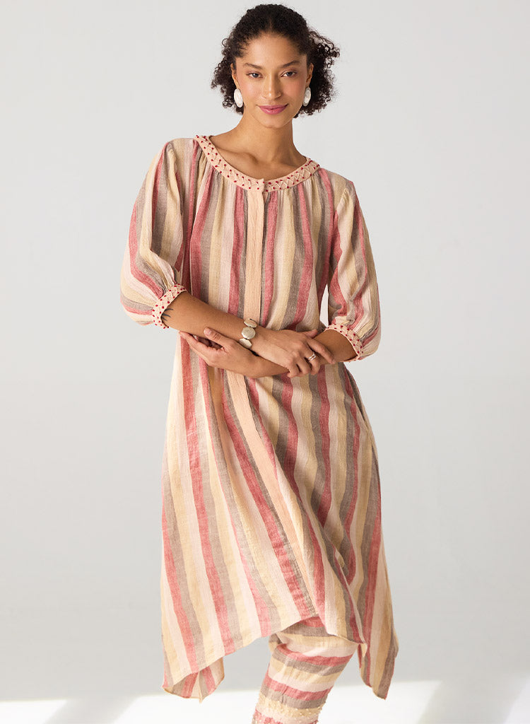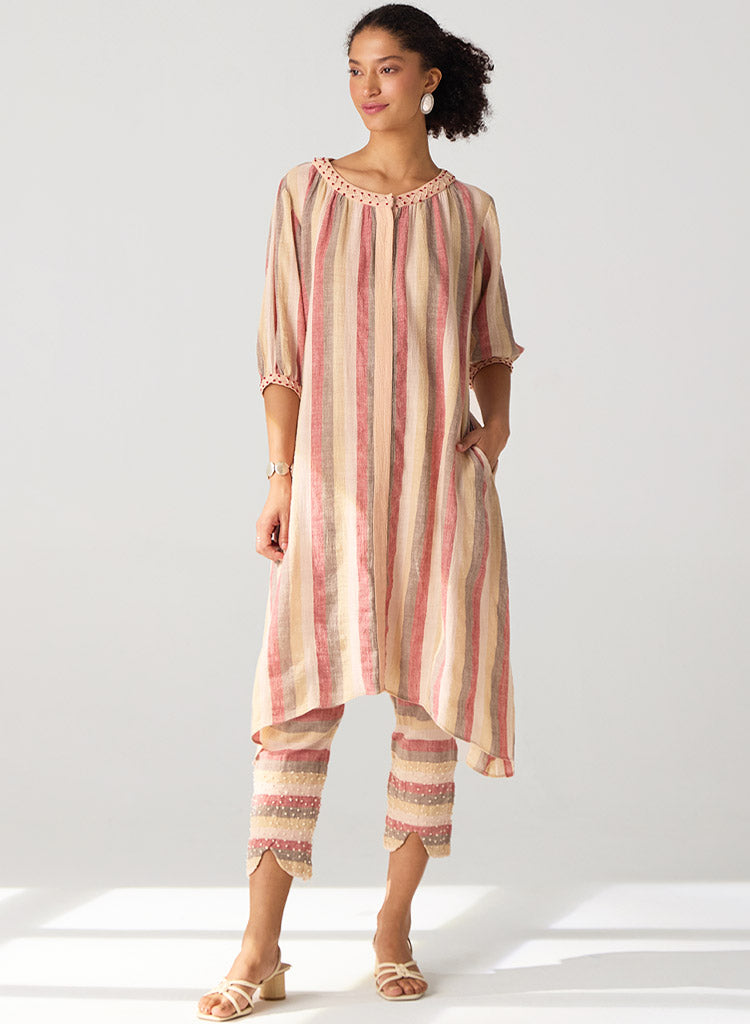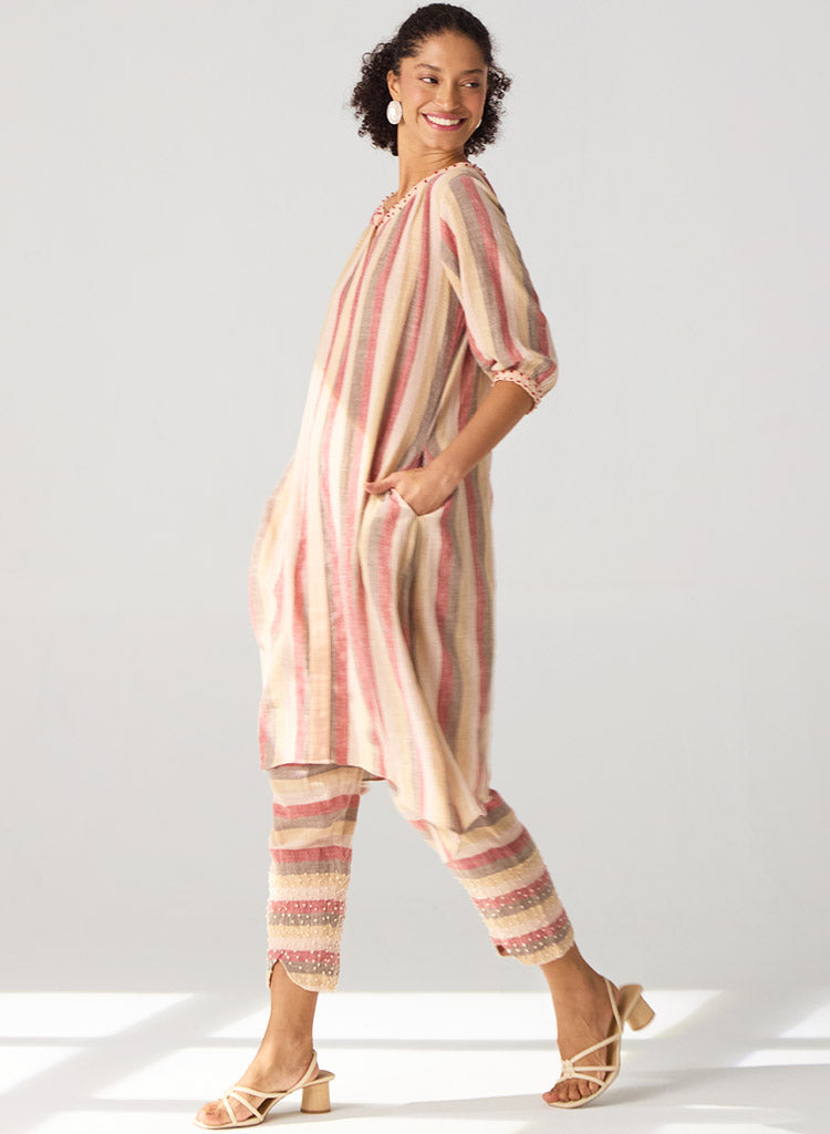 A two-piece set pairing an asymmetric tunic with curved hem pants. The tunic features an embroidered round neck and a front fastening. Length 36". The matching pants feature hand embroidery detailing and side inseam pockets. Length 36". The model is 5'8", and is wearing size S.