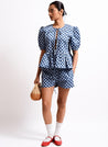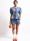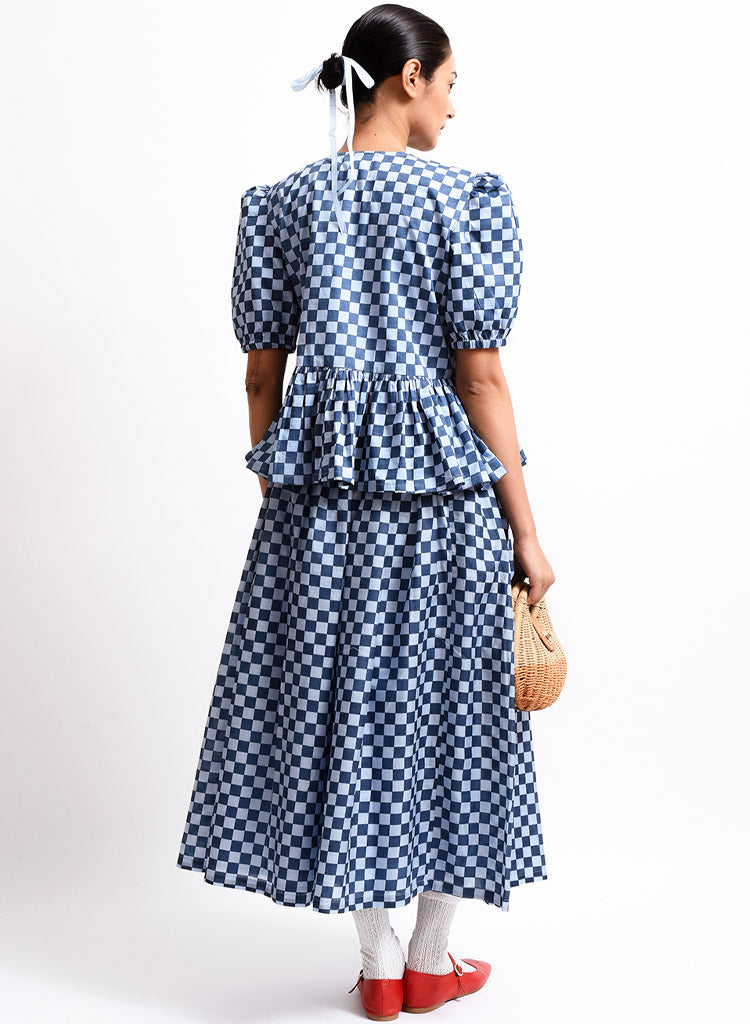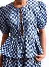 A checkered top with tie up details at the front and a frilled hem featuring a round neck and puff sleeves. Length 22". The model is 5’4 and is wearing a size XS.