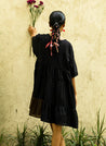 A mini tiered dress featuring a round neck and 3/4th sleeves. Length 33", Bust 56". The model is 5'6" and is wearing a free size.