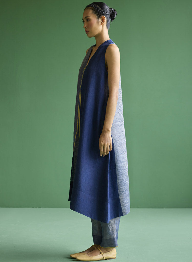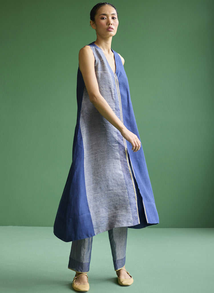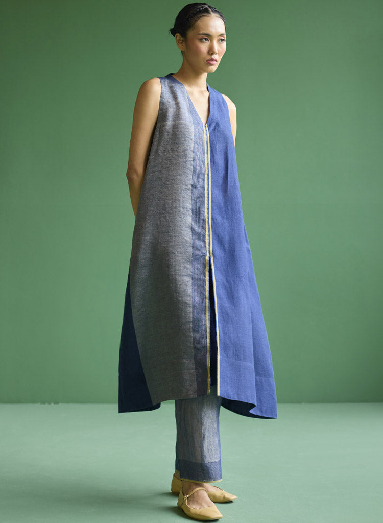 A two-piece set pairing the Ayana Border Top and the June Metallic Pants. The statement V-neck sleeveless tunic top features a soft handwoven vertical metallic border with stripes at the front and back with a woven coloured selvedge. The top has a high center slit and is detailed with intricate hand-embroidery at the back yoke. Length 44". Comes with a slip. The tapered pants feature inseam pockets, an elasticated back waistband with drawstring with a striped metallic border finished with a coloured woven selvedge. Length 36". The model is 5'8" and is wearing a size S.