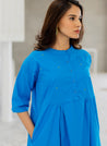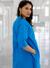 A two-piece set pairing the Azure Horizon Tunic and matching pants. The straight kurta with bead details features a mandarin collar neck, a front button placket, 3/4th sleeves and inseam pockets. Length 44". The matching pants feature a fitted front and elasticated back. Length 34". The model is 5'7" and is wearing size M.