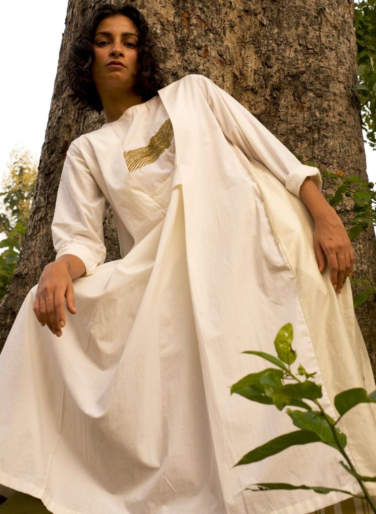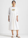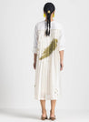 A two piece set pairing the Back Pleat Dress and the Broad Bottoms. The midi dress with a back pleat detail features a round neck and embroidery details in the front. Length 45". Comes with a Mul slip. The striped bottoms feature inseam pockets and an elasticated waist. Length 40". The model is 5'6" & is wearing size S.