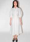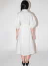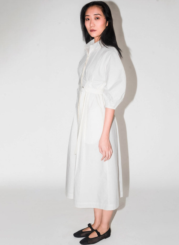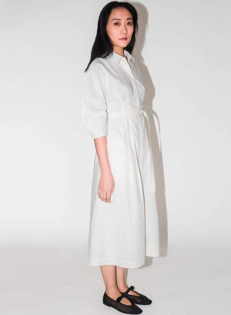 A midi shirt dress with pleated waist featuring a concealed placket and darted ballon sleeves. Comes with a detachable belt. Length 48". The model is 5'10", and is wearing size S.