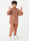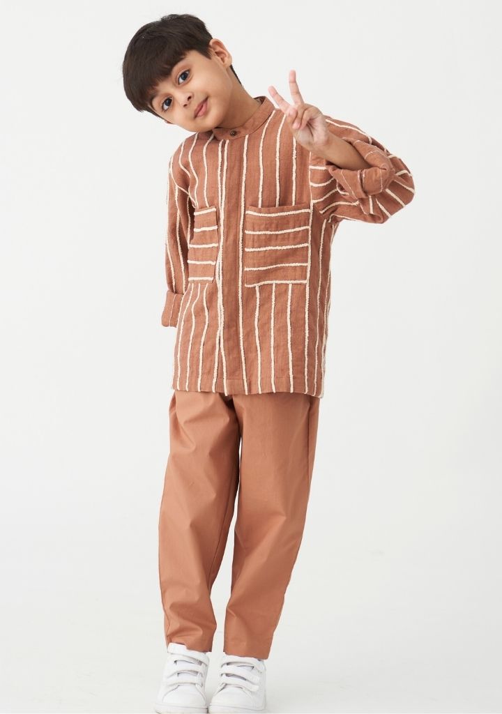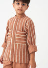 A band collar shirt with stripe print featuring a button-down placket and a patch pocket.
