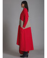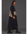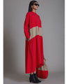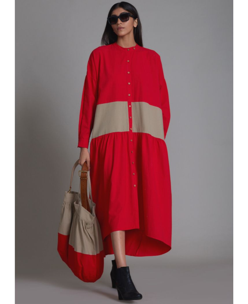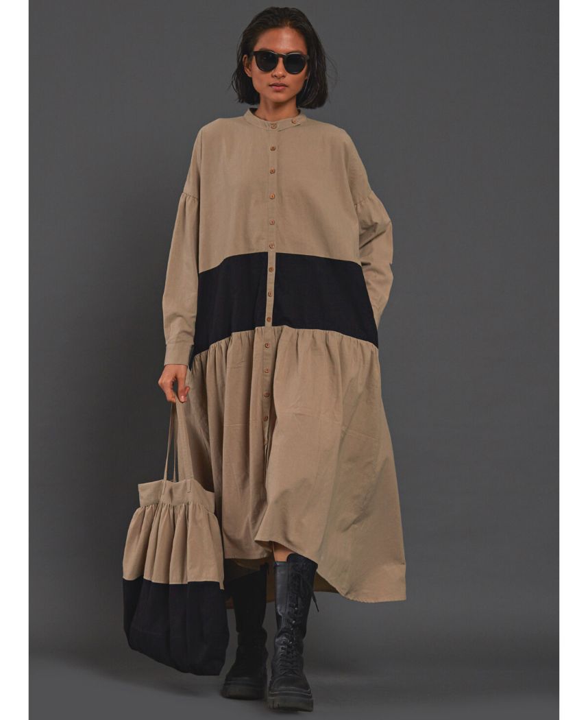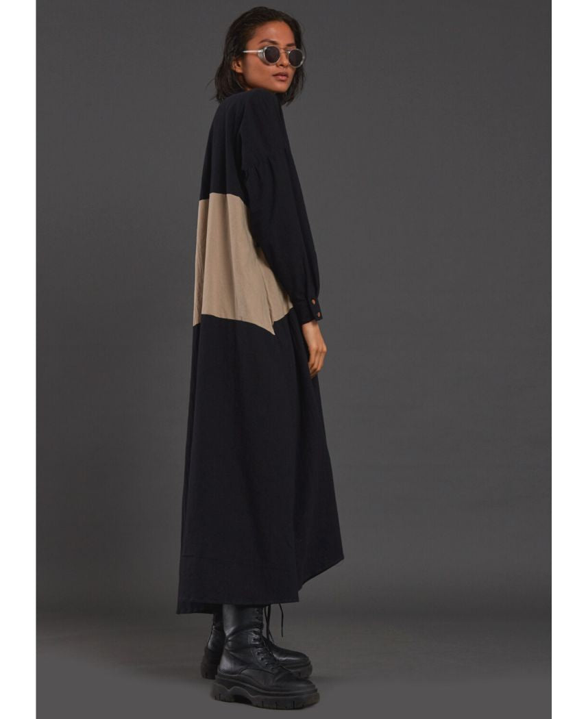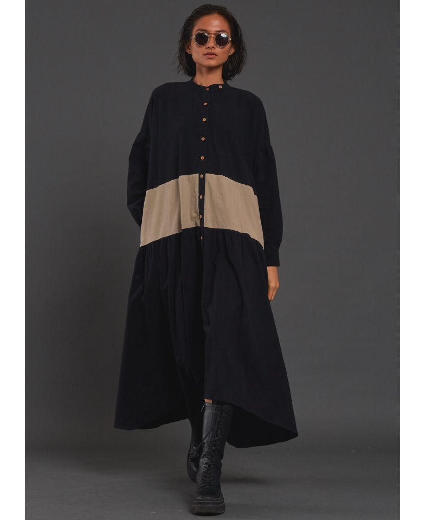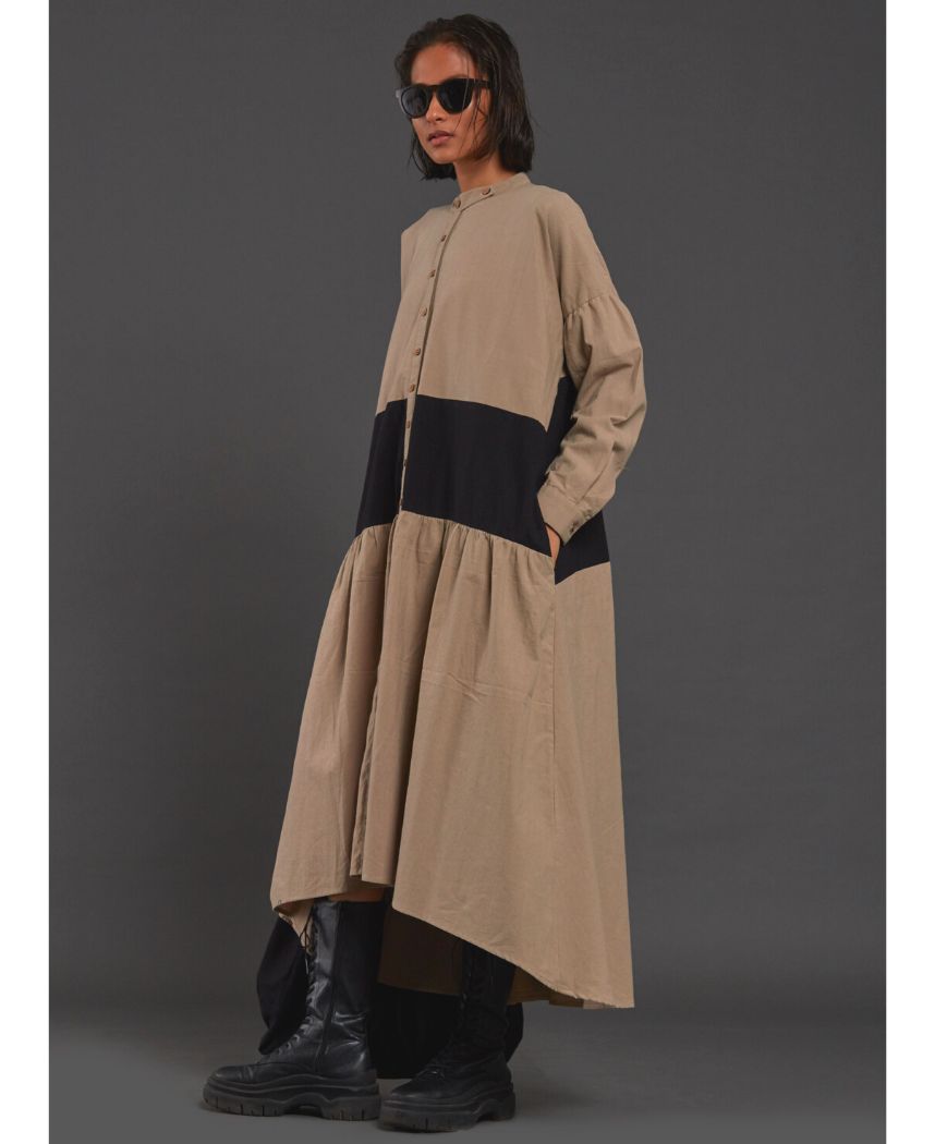 A colour-blocked ankle-length dress featuring a mandarin collar, a front button placket, cuffed sleeves and inseam pockets. Front length 46", Back length 51". The model is 5'9", and is wearing size XS.