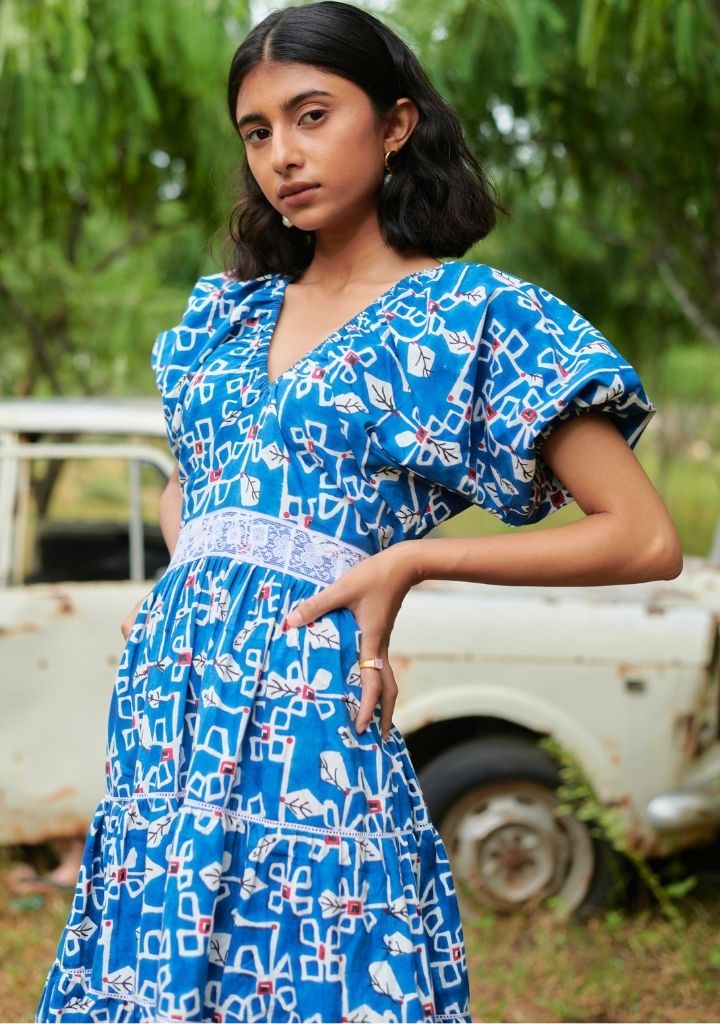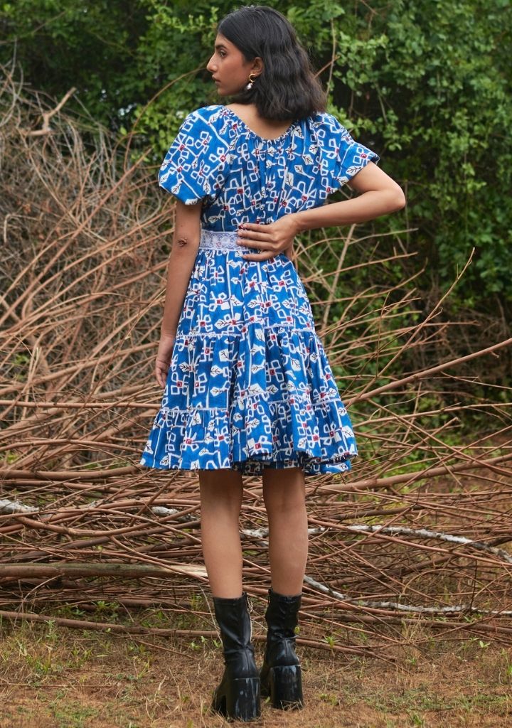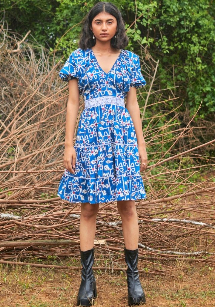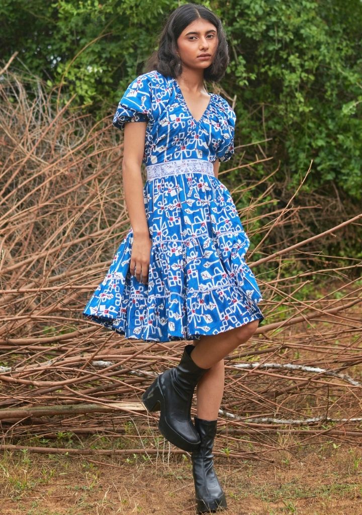 A printed geometrical floral mini dress with a gathered V neckline and lace detailing at the waist featuring puffed sleeves. Length 37”. The model is 6ft and is wearing a size S.