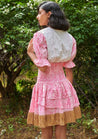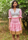 A chic, mini layered skirt featuring a wide smocked waist and raffia hem detailing. Length 21”. The model is 5'6" and is wearing a size S.
