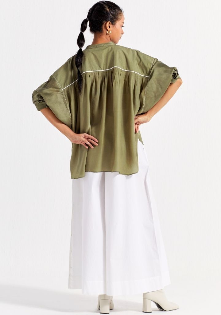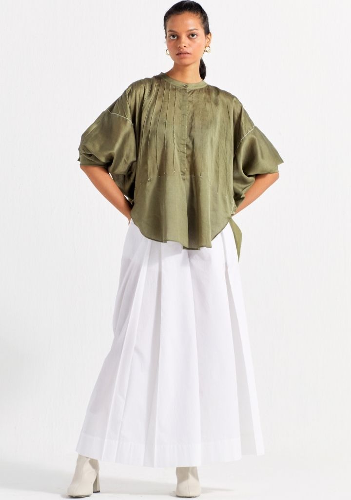 A two-piece set pairing the Bat Sleeve Top and the Inverted Box Pleat Bottoms. The relaxed-fitting top with pin tuck details, bat sleeves, side slits with a curved hem, and back gathered yoke features a band collar and a half button-down opening. Length 24". Made in Chanderi. The broad pants with inverted box pleat details and high side slits with buttoned closure feature a fitted waist and inseam pockets. Length 42".