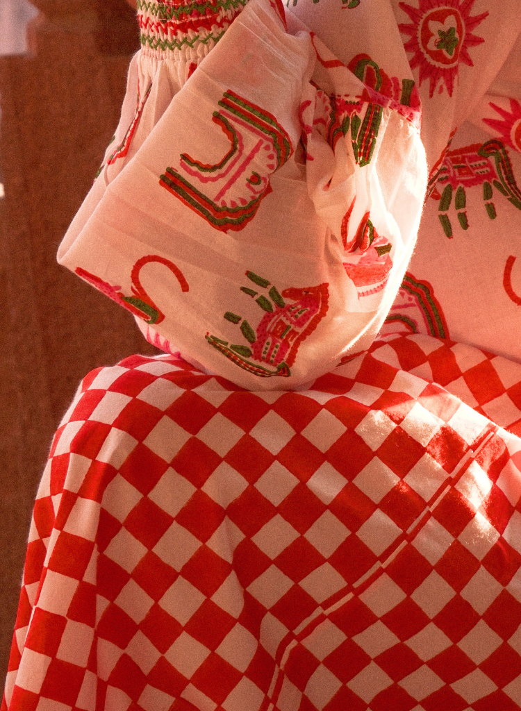 The Bawari Skirt features a hand block-printed checkered design in Azo-free colors. Designed with elegant pleats, it offers a structured yet flowy silhouette that moves beautifully with every step. With its comfortable, adjustable waist and timeless charm, this skirt is perfect for effortless, all-day wear. The model is 5'8" and is wearing size XS-S.