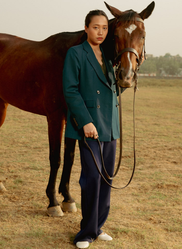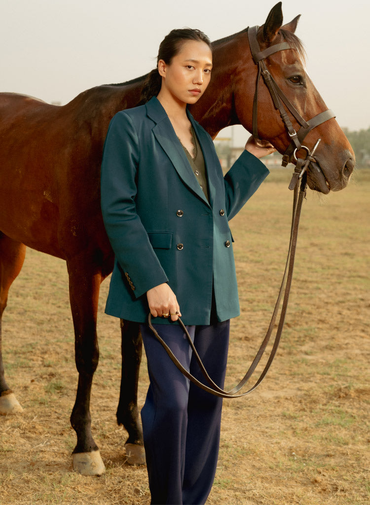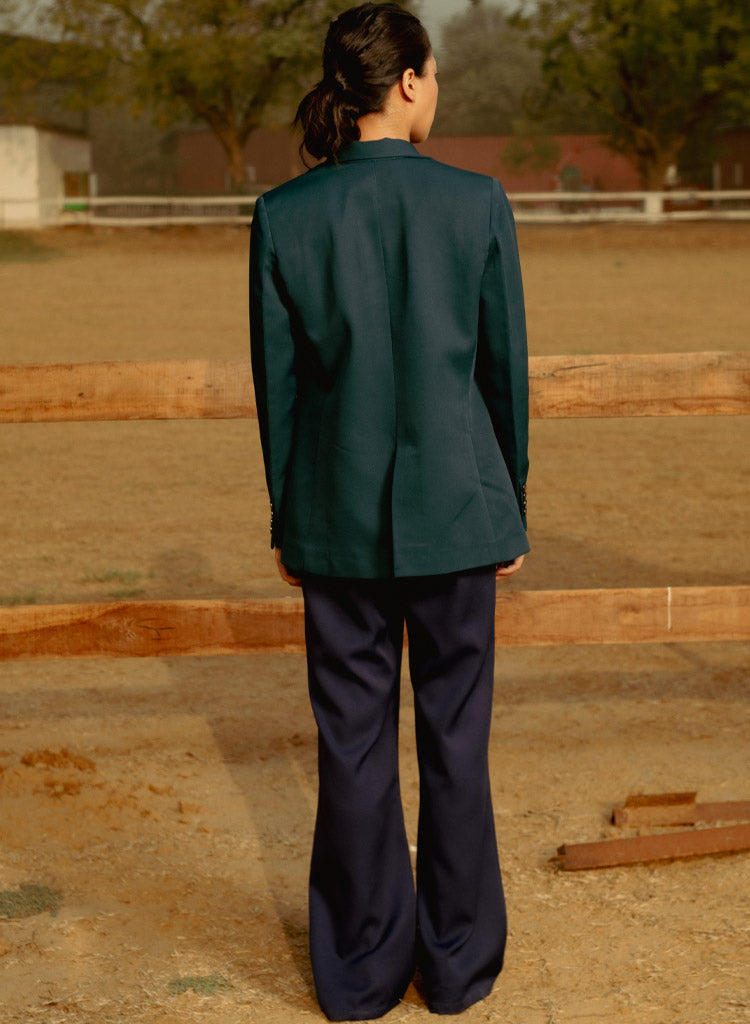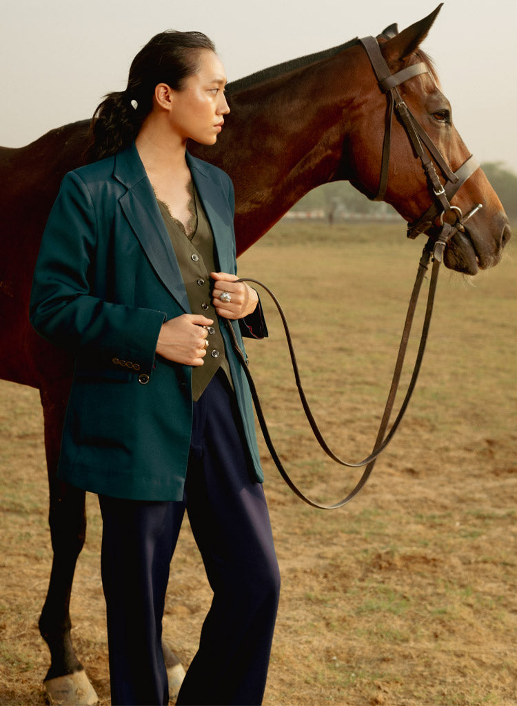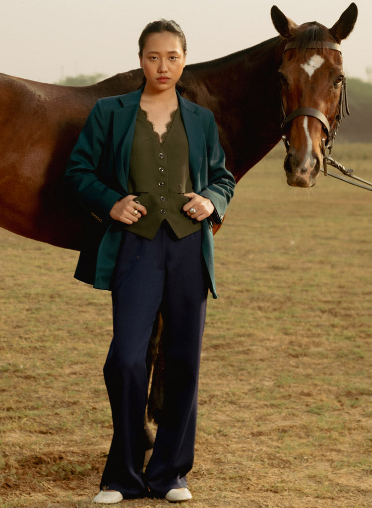 A three-piece set pairing an oversized blazer, Riz waistcoat and matching pants. The oversized 4-button blazer features a lapel collar and welt pockets. Length 28". The matching pants with pleat details feature a fitted waist and inseam pockets. Length 43". The tailored fitting waistcoat features Chantilly lace detailing on the lapel collar. Length 22".