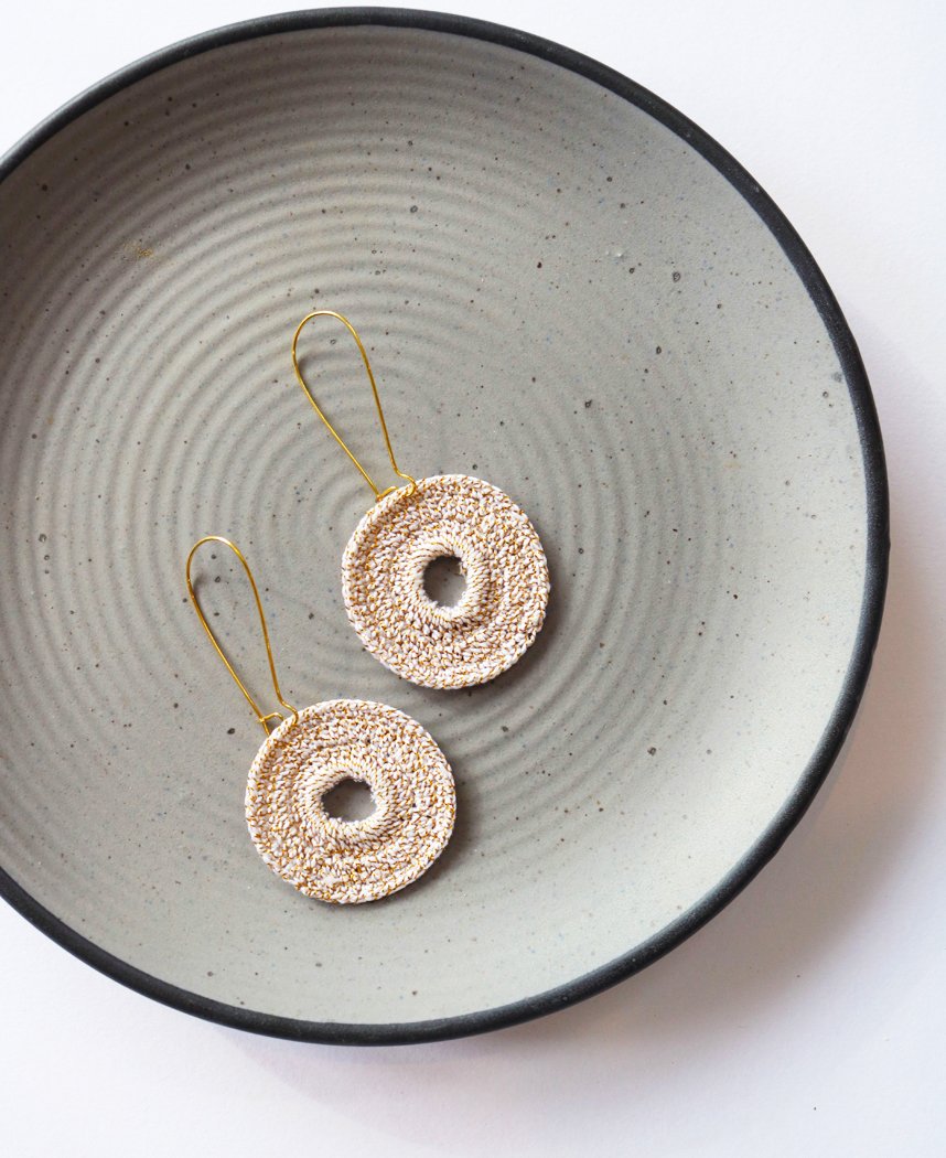 Doughnut shaped sparkling lightweight danglers in classic colours. This piece of jewelry is handmade with a crochet needle and a coloured yarn by women in suburbs of Delhi. Dimensions - 6.5 x 3.5 cm.