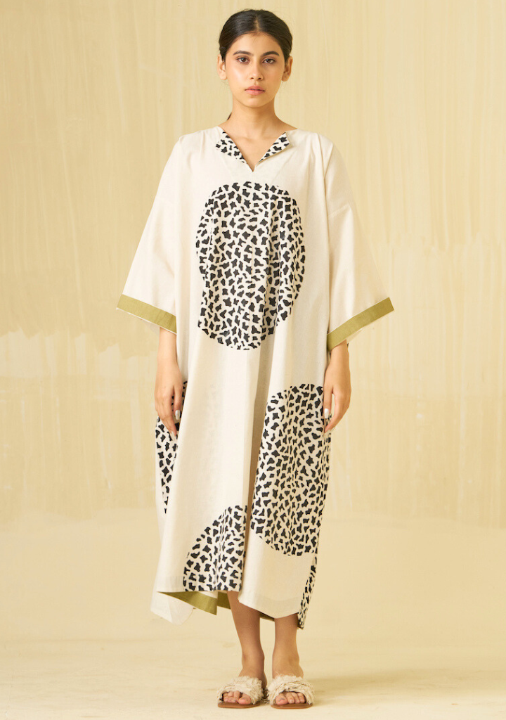 A hand block printed oversized dress featuring a discreet overlap with button closures and contrast trims. Length 45", Bust 60", Shoulders 25". The model is 5'5" and is wearing size S.