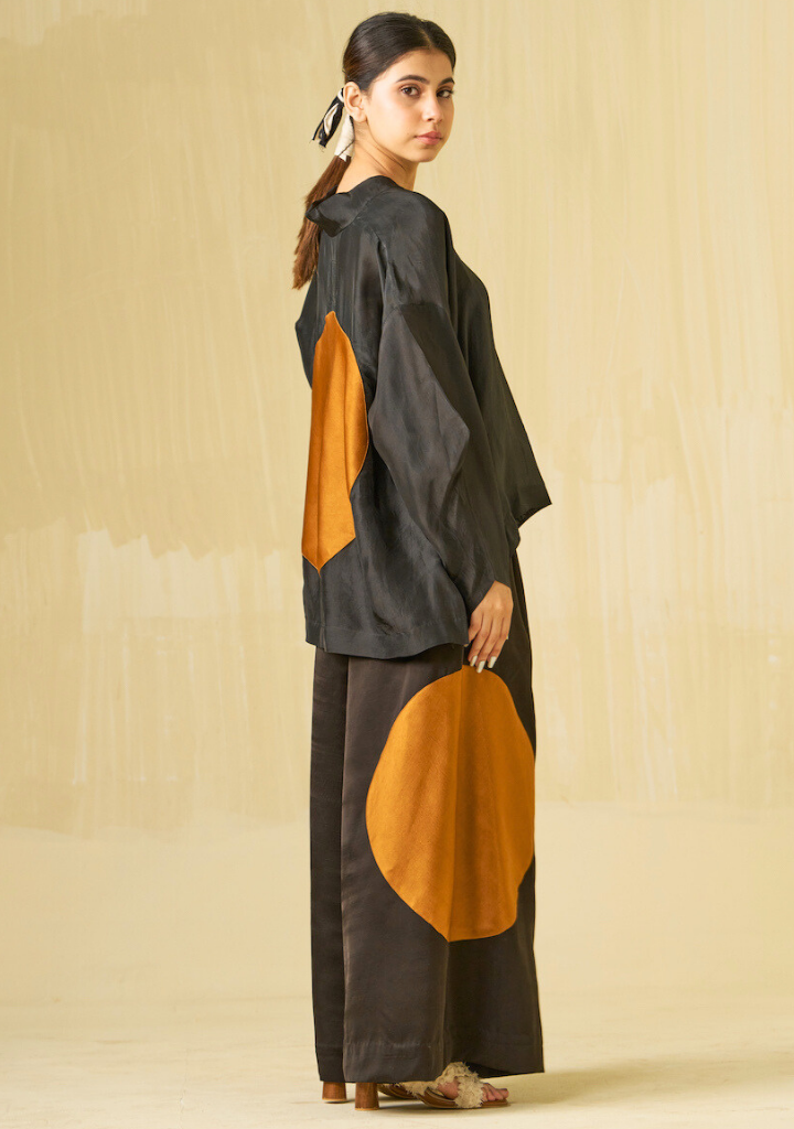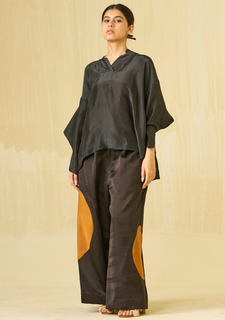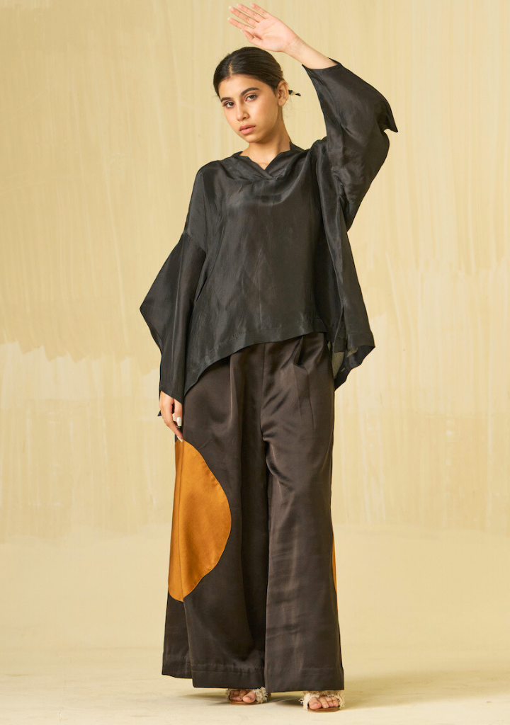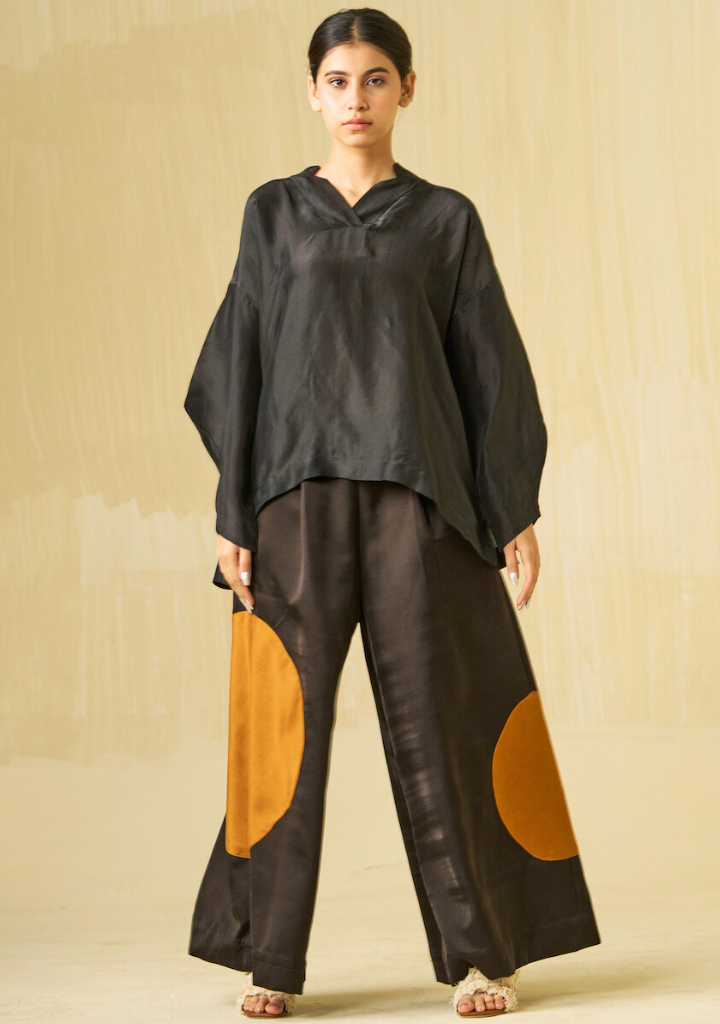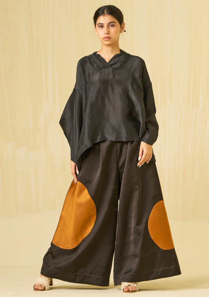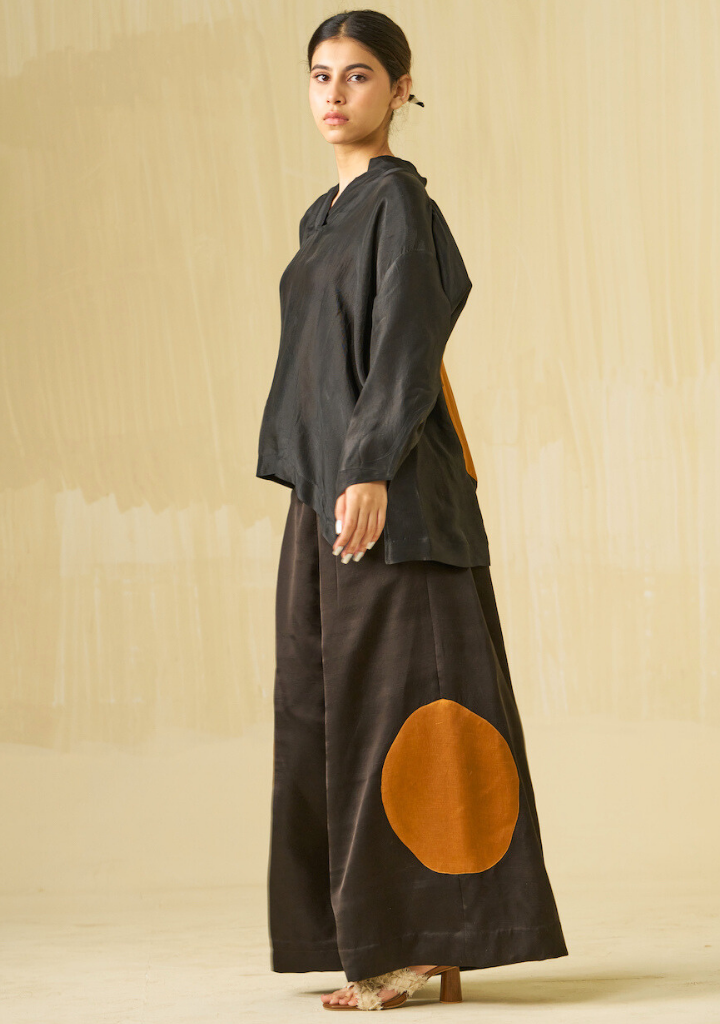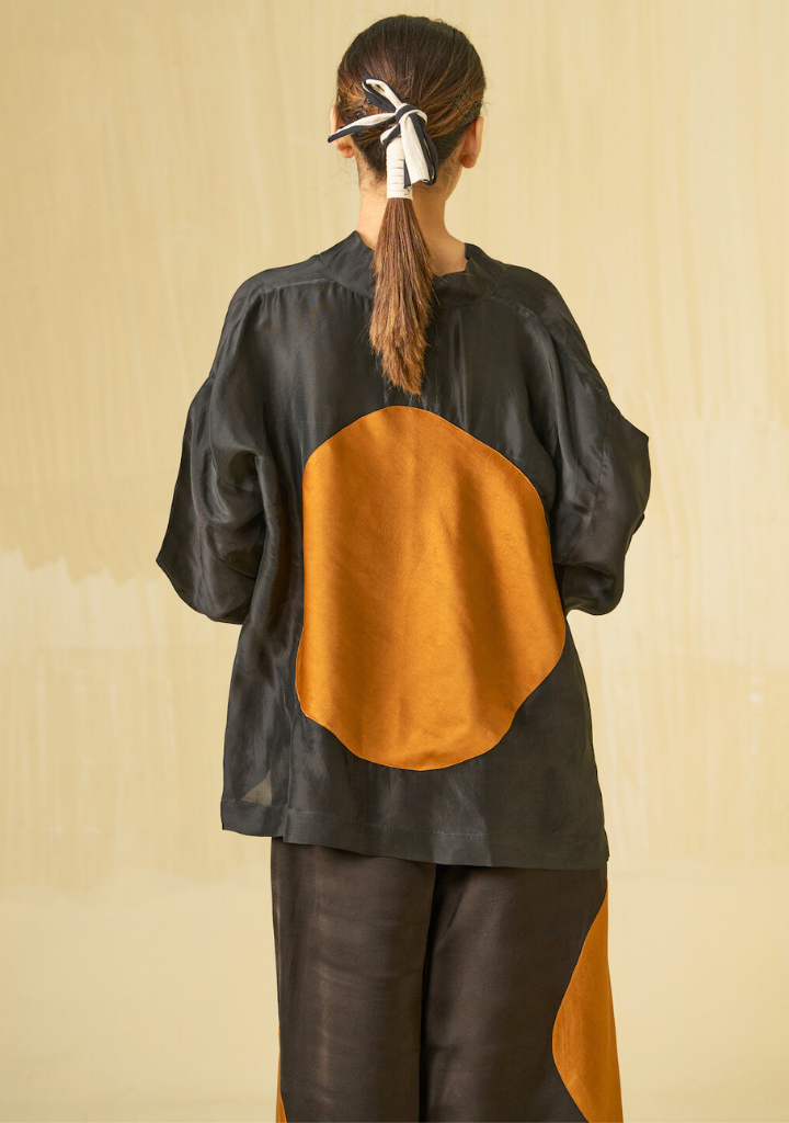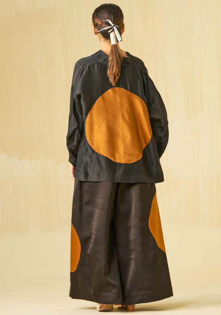 A relaxed-fitting top with contrast circular appliqué at the back and a high-low hem featuring overlapped collar and long, square-cut sleeves. Length 25". The model is 5'5" and is wearing size S.