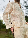 A two piece set pairing the Beige Candy Crochet Shirt and matching trousers. The crochet shirt features a thin collar, a front button placket with wooden buttons and long sleeves. Length 28.5”. The matching trousers feature a fitted waist with a front opening and inseam pockets. Length 39". Lined. The model is 6ft and is wearing a size S.