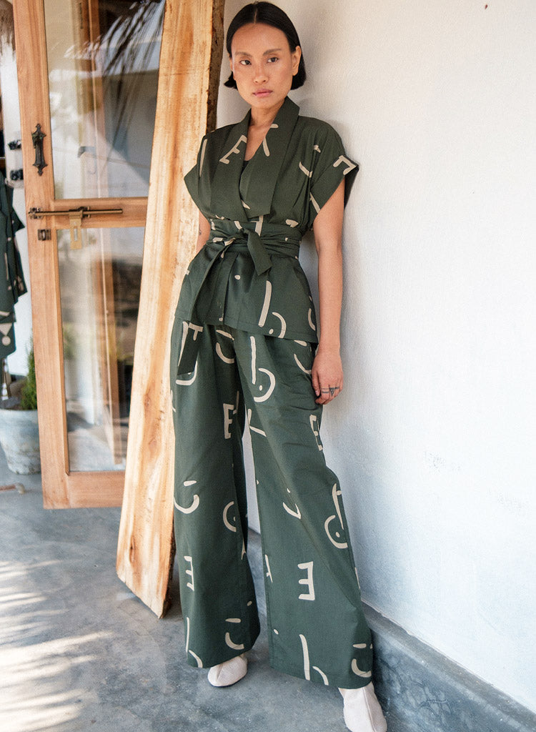 A two-piece set pairing the Berlin Shawl Collar Top and the Friday Flared Pants. The summer jacket with a shawl collar, contrast piping detail and a statement belt features a drop shoulder and folded armhole finish detail. The relaxed-fitting flared pants with pleat details in the front feature side pockets. The model is 5'6", and is wearing size M.
