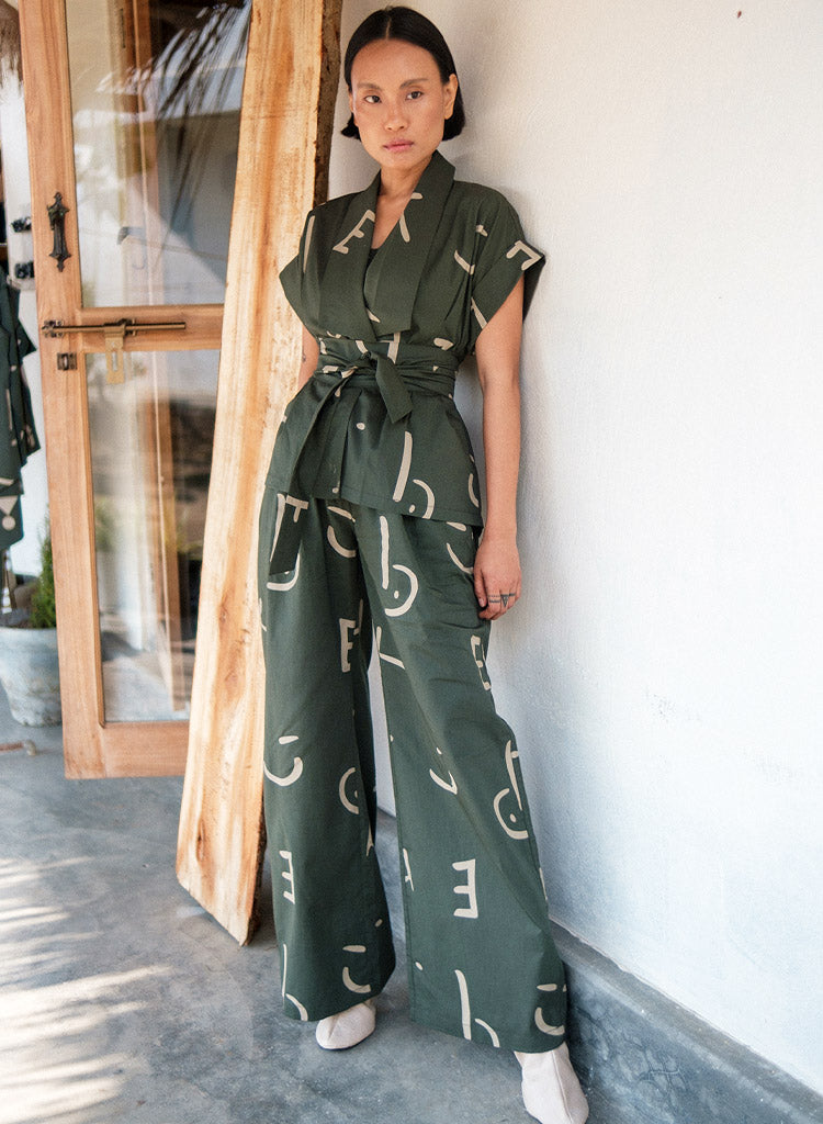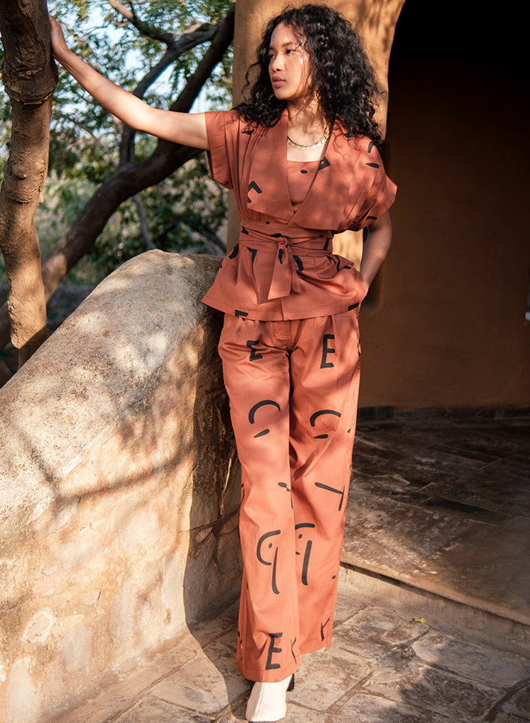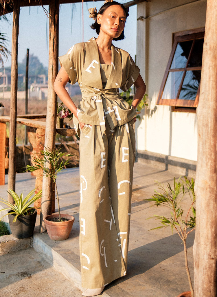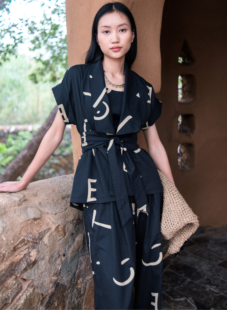 A summer jacket with a shawl collar, contrast piping detail and a statement belt featuring drop shoulder and folded armhole finish detail. The model is 5'7", and is wearing size S.