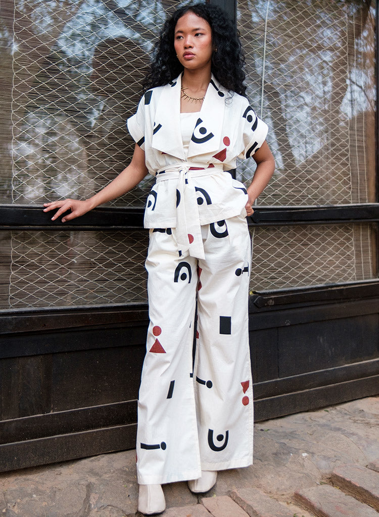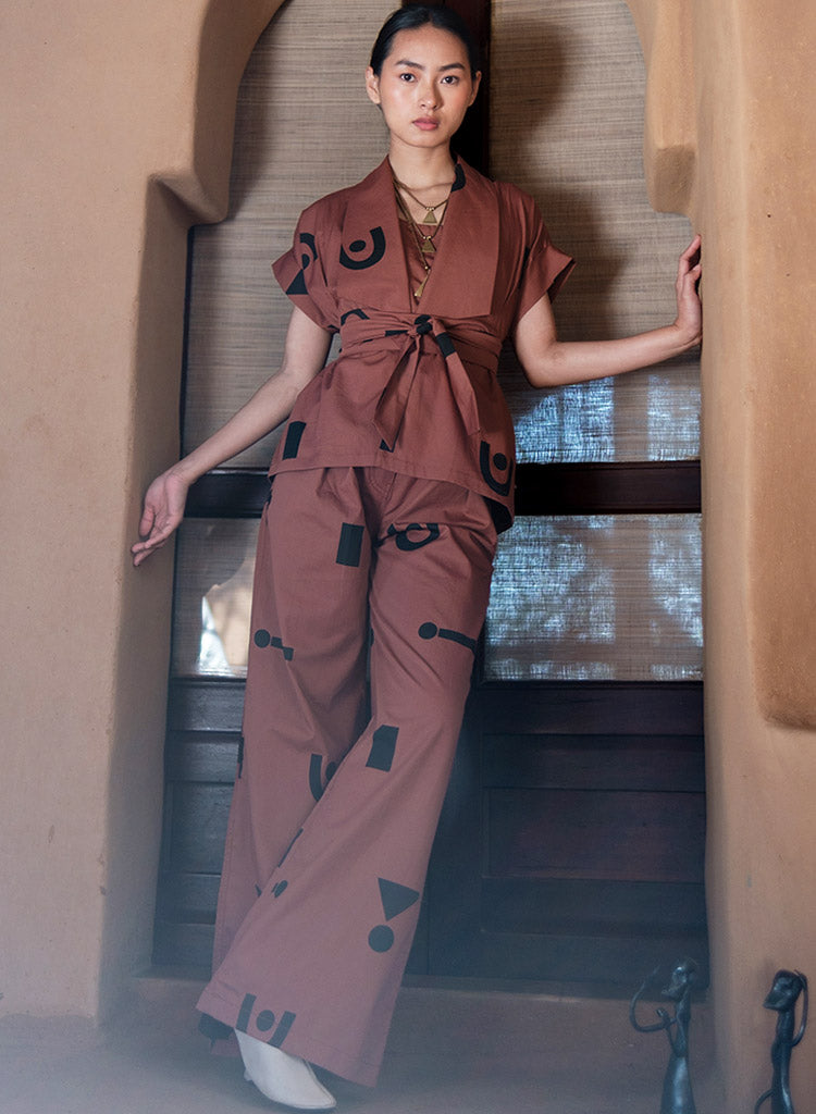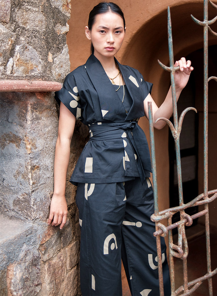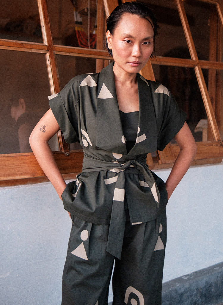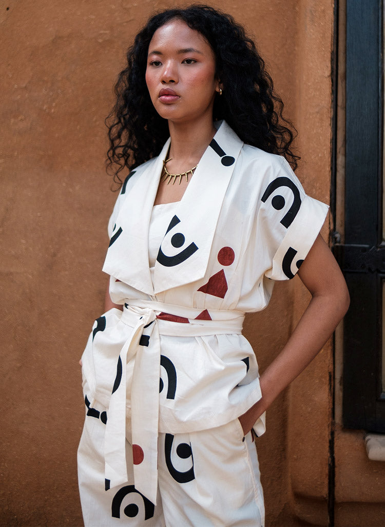 A summer jacket with a shawl collar, contrast piping detail and a statement belt featuring drop shoulder and folded armhole finish detail. The model is 5'7", and is wearing size S.