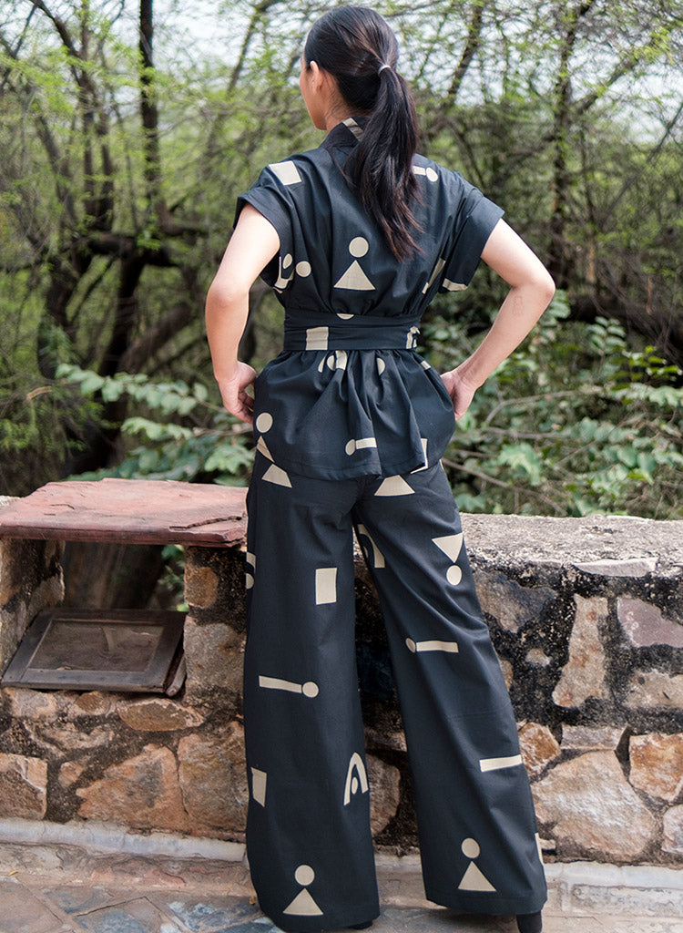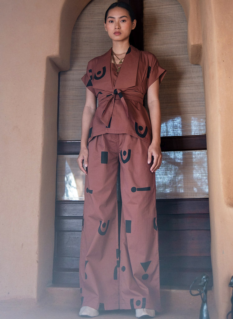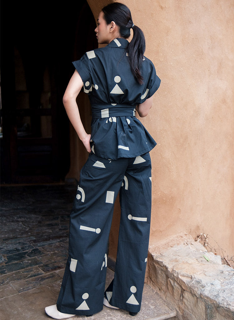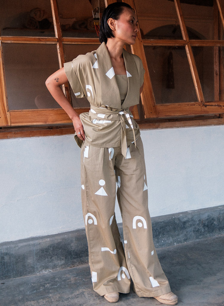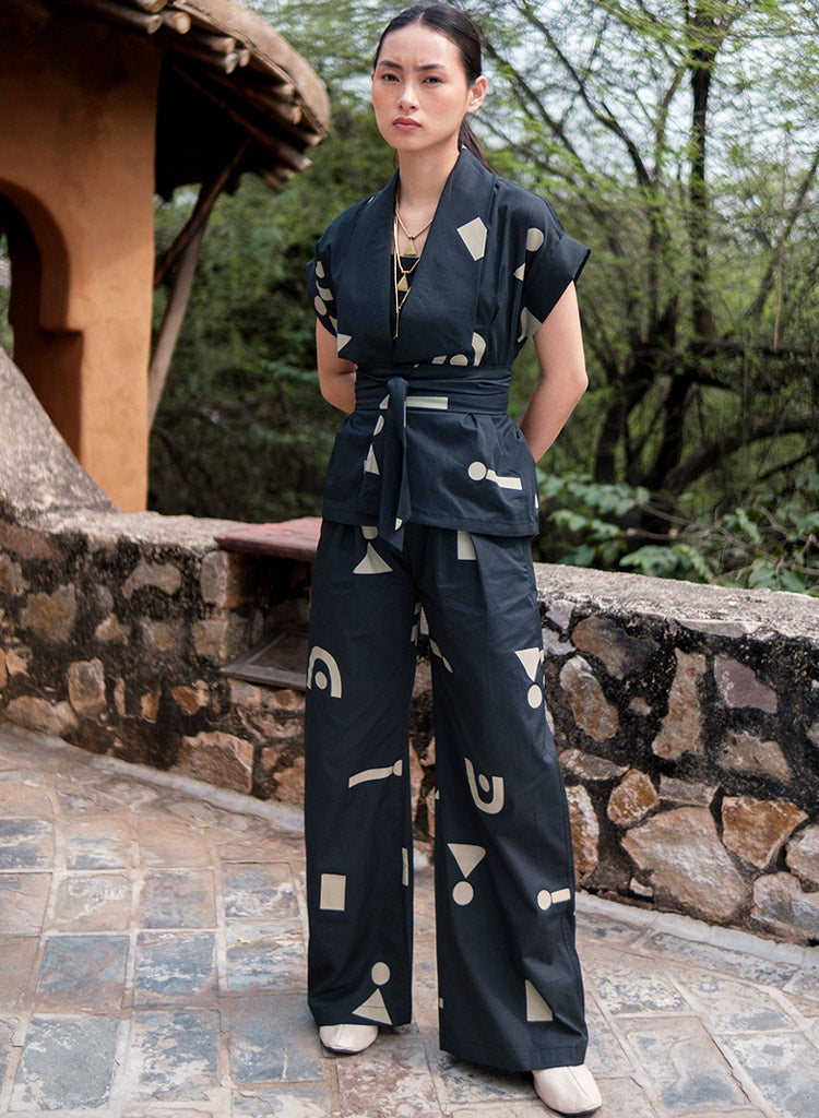A summer jacket with a shawl collar, contrast piping detail and a statement belt featuring drop shoulder and folded armhole finish detail. The model is 5'7", and is wearing size S.