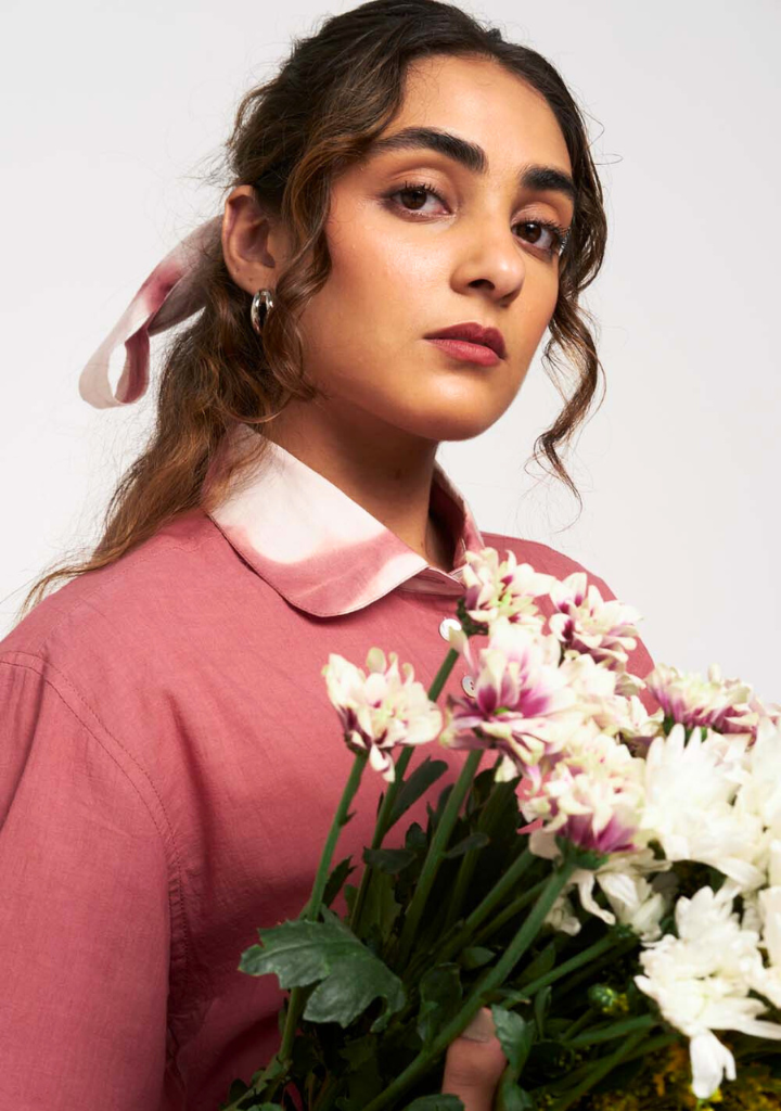 A lightweight classic shirt with an added floral clamp-dyed pattern on the collar and cuffs. Features a rounded shirt collar and long sleeves. The model is 5’7" and is wearing size S.
