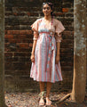 A striped wrap dress with statement cut-out sleeves. Features solid panels and a tie-up closure at the waist. Length 42". The model is 5'8", and is wearing size M.