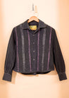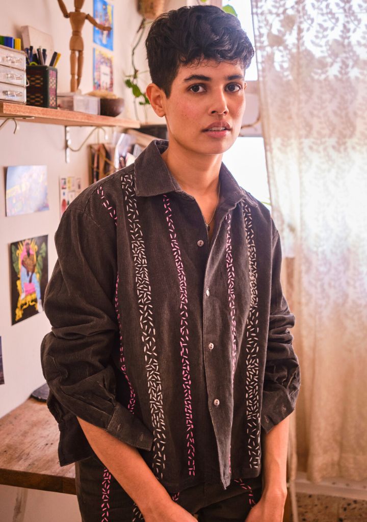 A regular-fitting shirt with cotton thread embroidery featuring a spread collar, knife pleat detail and tapered bishop sleeves. Length 21". The model is 5'5" and is wearing size S.