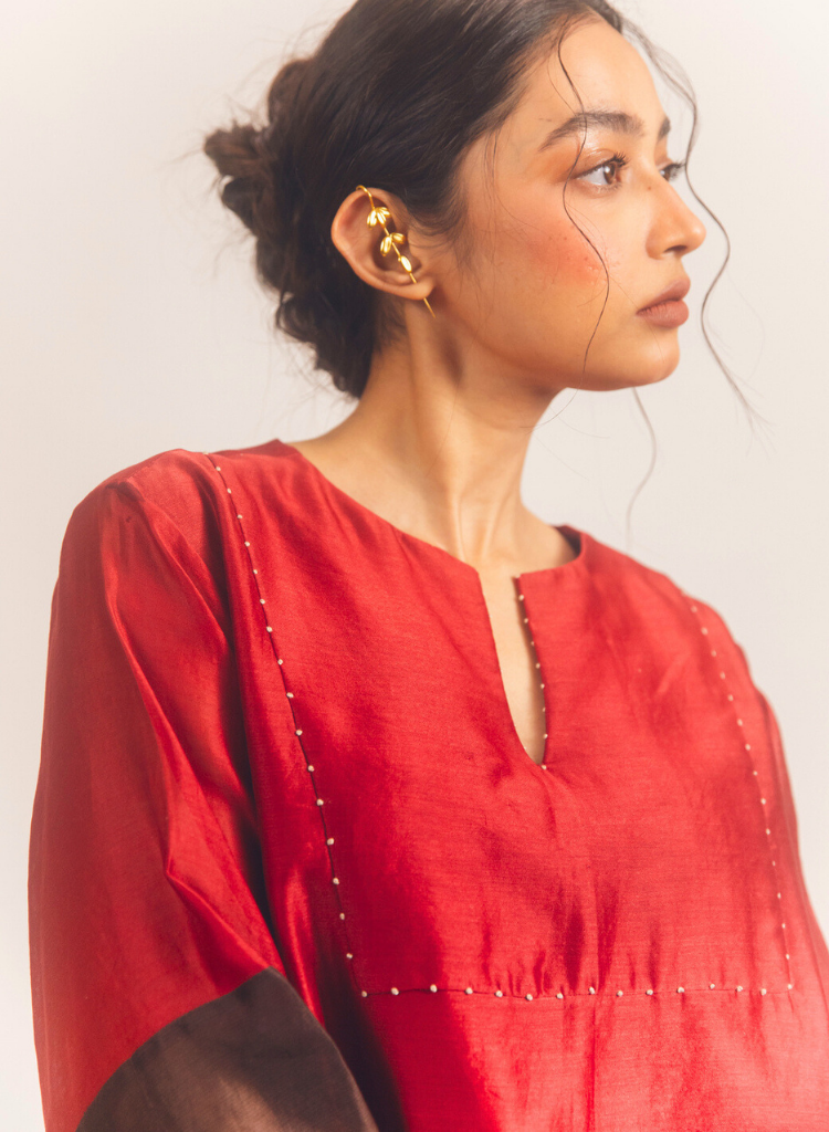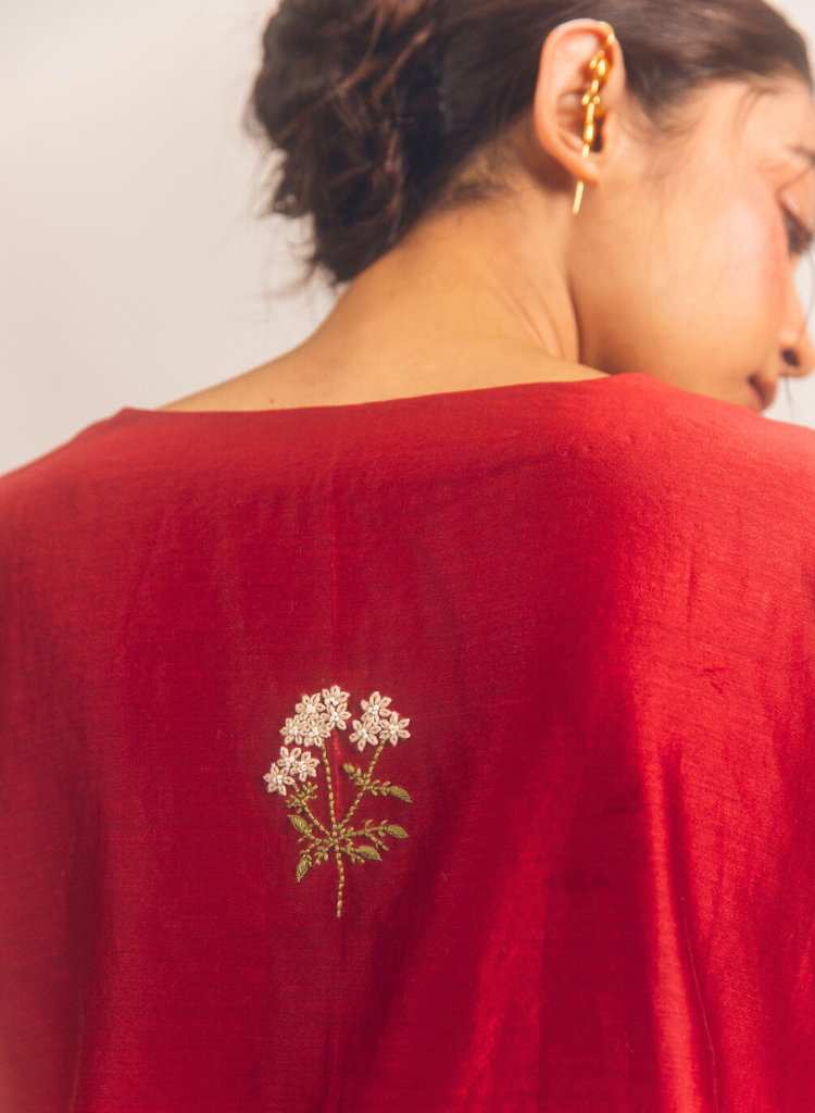 A two-piece set pairing a top and a skirt. The top features embroidered motif at the back. Length 28". The midi skirt features a gathered waist. Length 35". The model is 5'7" and is wearing a size S.