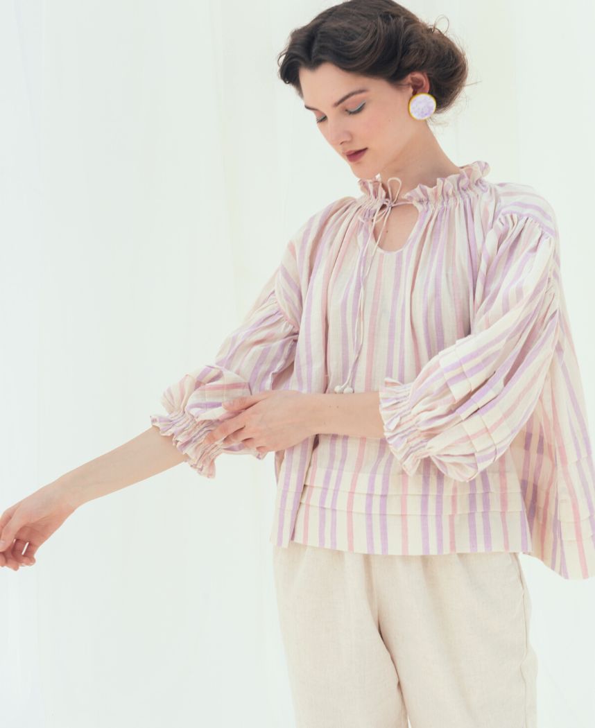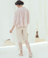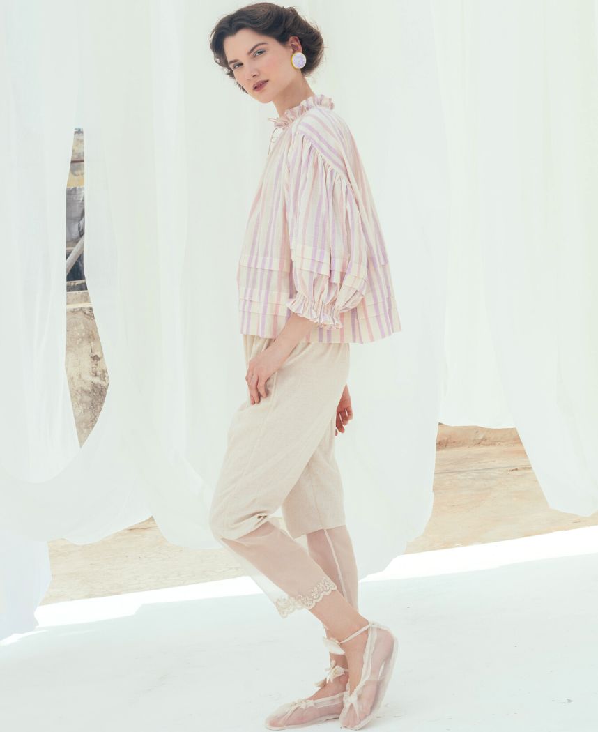 A two-piece set pairing the Bloom peasant top and Chamomile Pants. The relaxed fitting top features a tie-up neck with smocking detail and balloon sleeves with a smocked edge. Length 23". Made in handwoven Mul cotton.