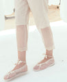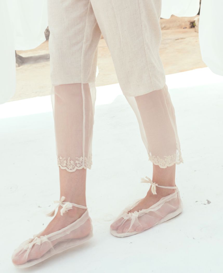 The relaxed-fitting tapered pants with hand embroidery details feature an elasticated drawstring waist and inseam pockets. Length 35". Made in a blend of cotton and organza.
