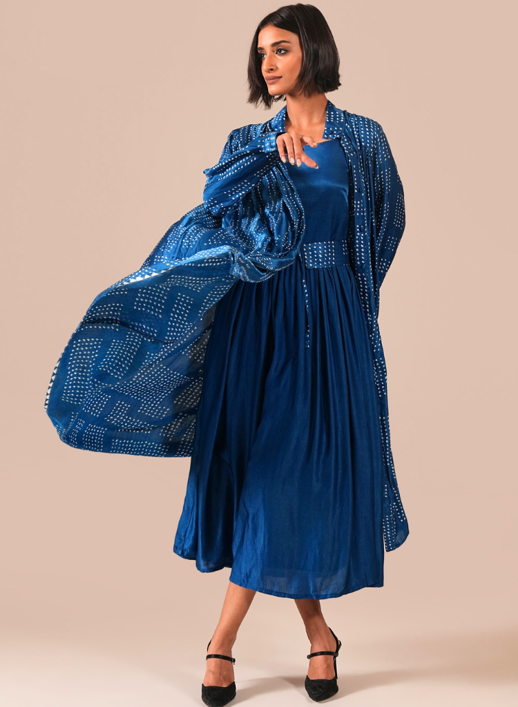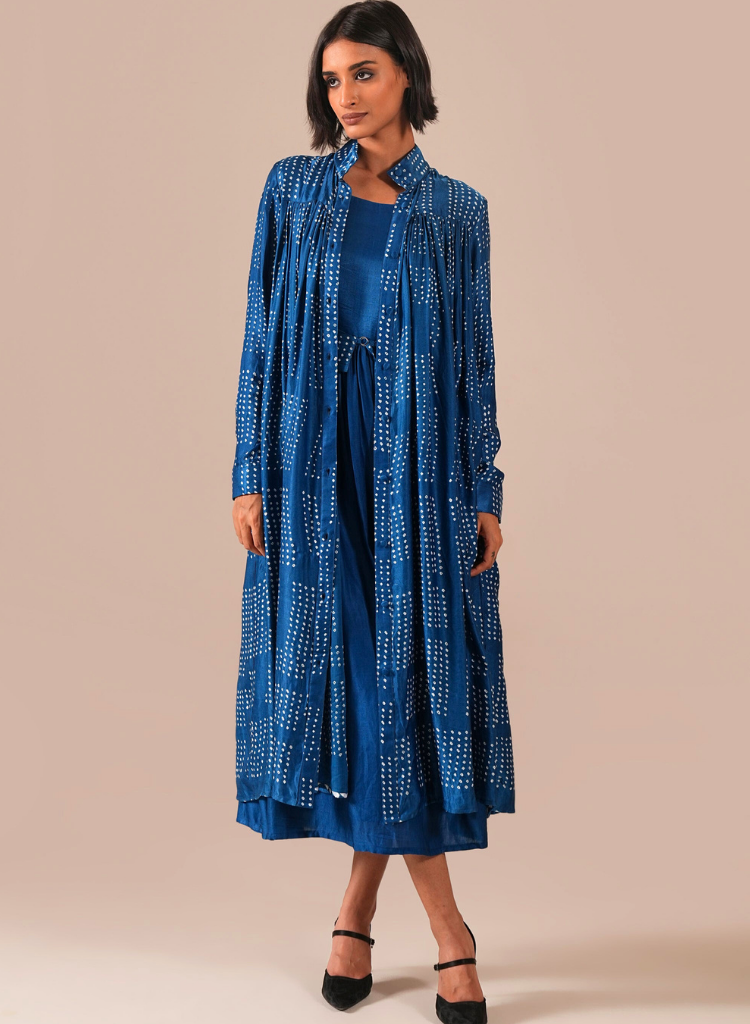 A two-piece set pairing the Silk Sonata Dress and a overlay. The sleeveless gathered fit-and-flare dress features side pockets, adjustable straps, and a back zipper. Length 51". Fully lined. The long overlay features full sleeves. Length 48". Comes with a versatile tie belt. The model is 5'6" and is wearing a size S.