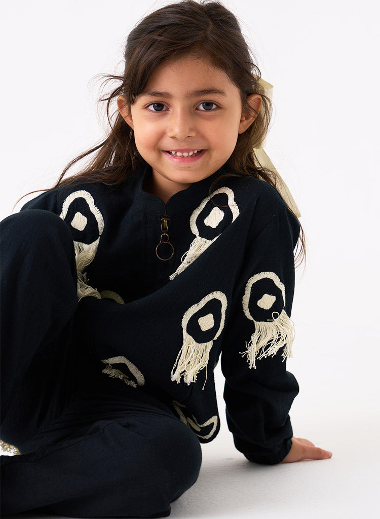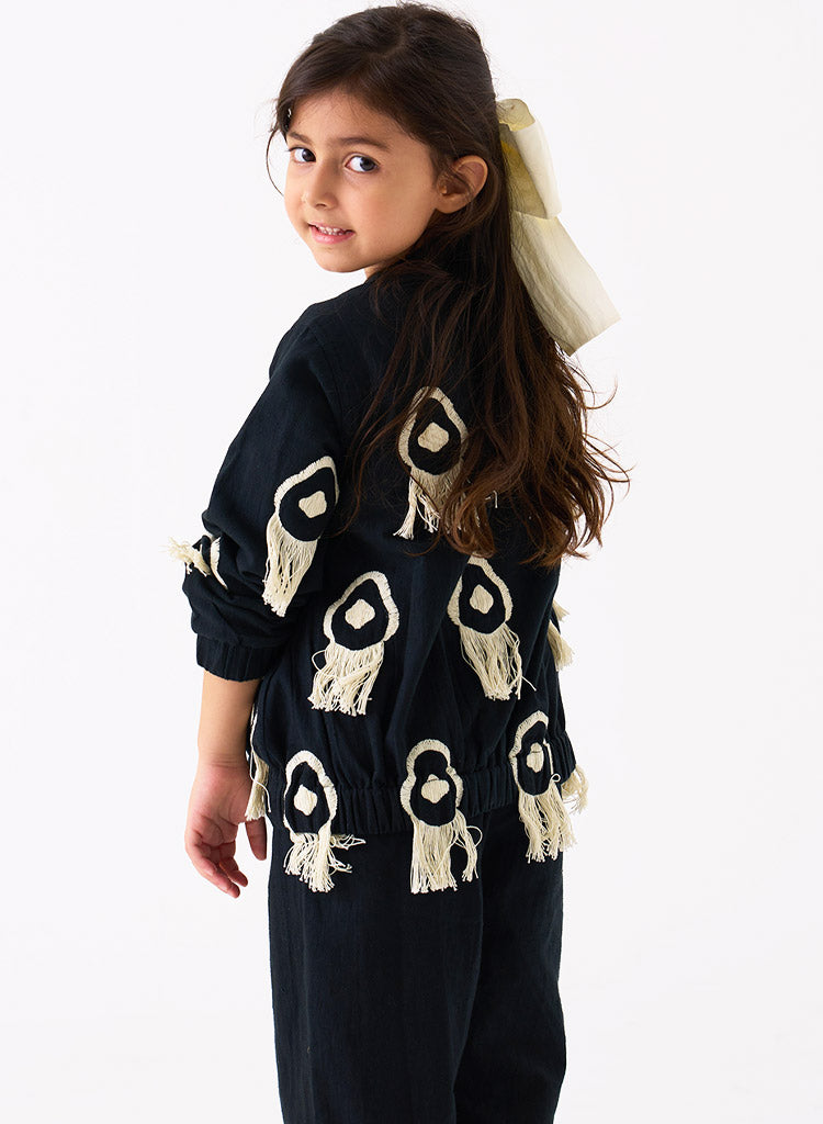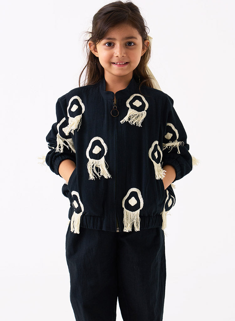 A two-piece set pairing the Bomber Jacket and matching pants. The bomber jacket with fringe embroidery detail features a front open zipper and side pockets. The matching solid pants feature an elasticated waist and inseam pockets.
