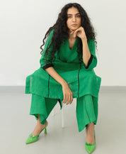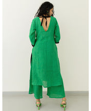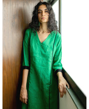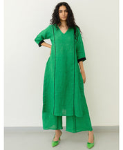 A two-piece set pairing the Bottle Green Linen Kurta and matching pants. The straight kurta with piping details features a V-neck, side slits, and a back tie-up closure. Length 44". The matching palazzo pants with piping details feature a fitted front and elasticated back. Length 36". The model is 5'7" and is wearing size M.