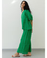A two-piece set pairing the Bottle Green Linen Top and matching pants. The collared short top features a V-neck and tie-up detail at the sleeves. Length 25". The matching palazzo pants with piping details feature a fitted front and elasticated back. Length 36". The model is 5'7" and is wearing size M.