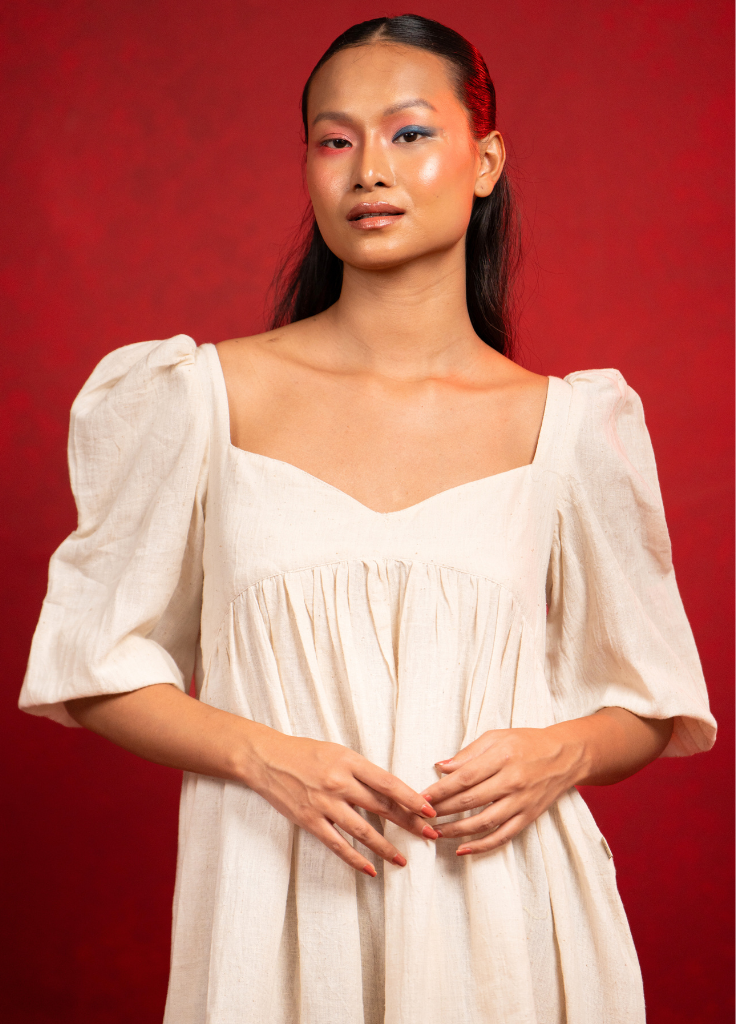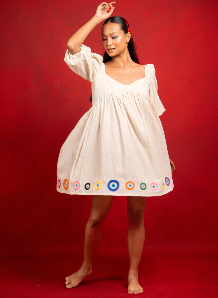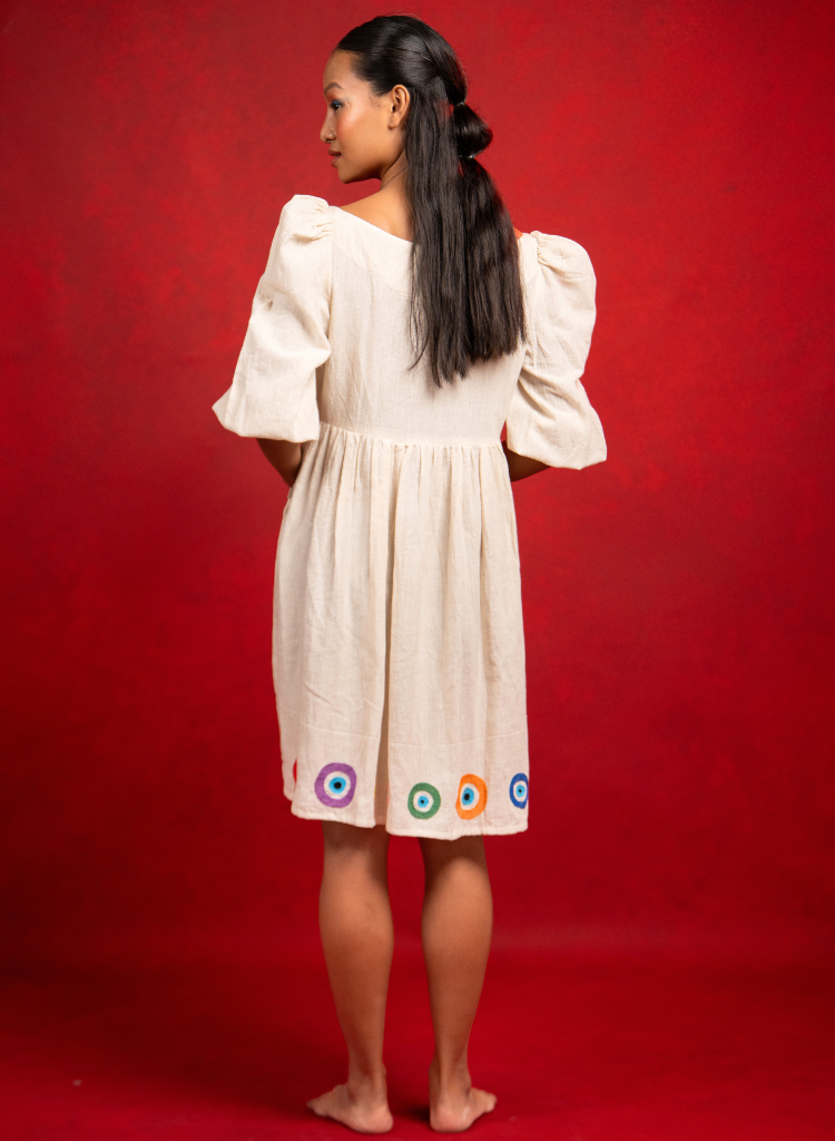 A relaxed-fitting mini dress showcasing colourful, round evil eye motifs in cross-stitch hand embroidery and puffed sleeves. Length 36". The model is 5'5" and is wearing size S.