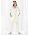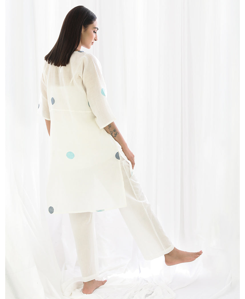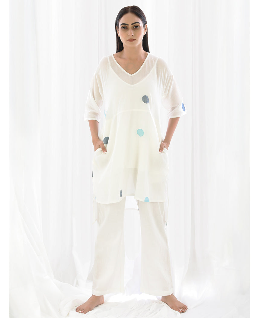 Relaxed straight leg pants with inseam pockets and an elasticated waist. Unlined. Made in 100% cotton. Length 38".