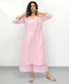 A straight kurta with piping details featuring a V-neck, side slits and a back tie-up closure. Length 44". The model is 5'7" and is wearing size M.