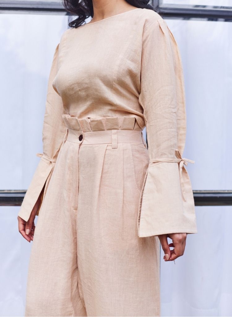 A fitted crop top with back button-down button fastening, back cut-out detail, drop shoulder, and pleats on the long sleeves with elongated cuff and tie-up detail featuring a round neck. Length 17". The model is 5'6" and is wearing size S.