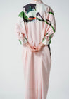 A relaxed-fitting printed midi dress with an embroidery detail featuring a collared neck, a concealed front button placket, and inseam pockets. Length 48". The model is 5'7" and is wearing a free size.