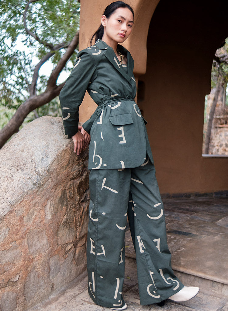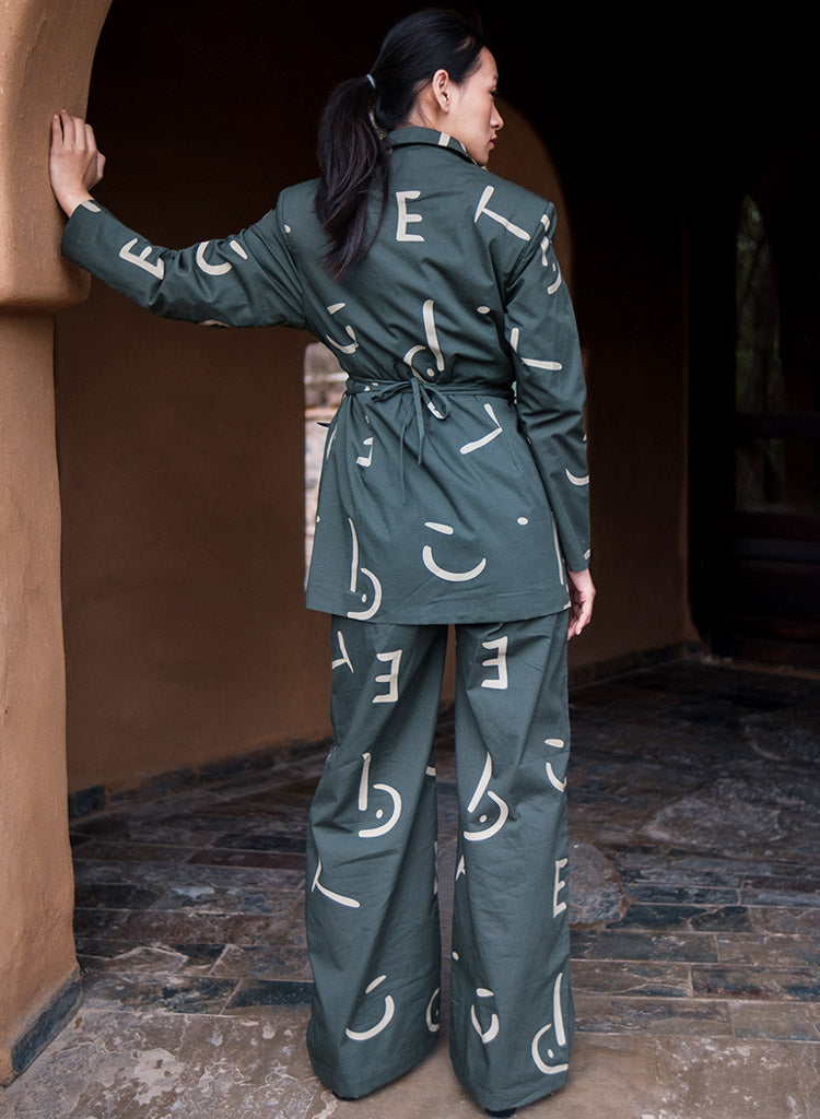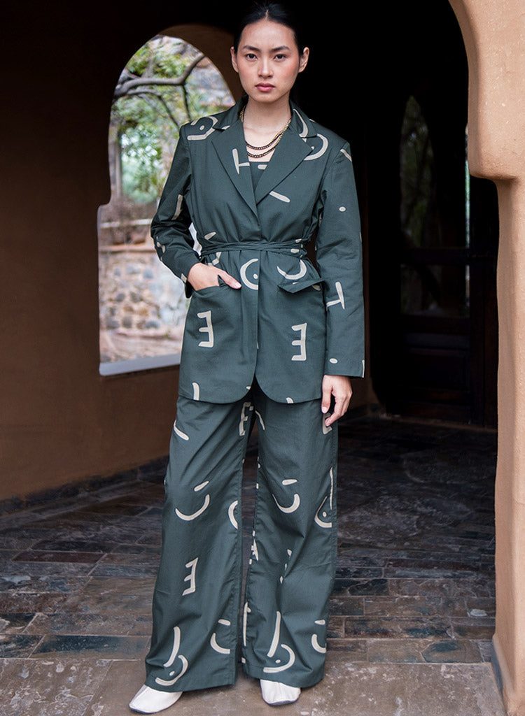 A two-piece set pairing the Cambridge Blazer and the Friday Flared Pants. The oversized classic blazer with a cinched waist strap and flap details features a notched collar and long sleeves. The relaxed-fitting flared pants with pleat details in the front feature side pockets. The model is 5'6", and is wearing size M.