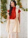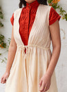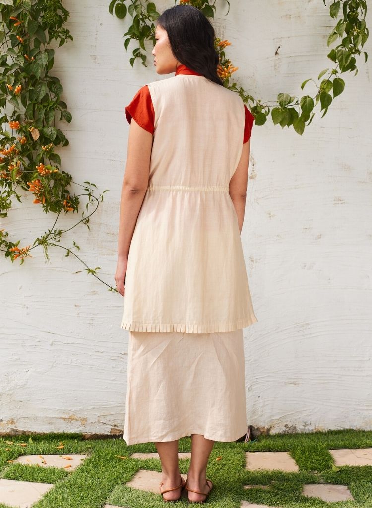 A sleeveless jacket with pintuck details on the shoulder, pleats at the hemline, and an adjustable drawstring waist featuring side pockets. Length 36". The model is 5'11" and is wearing size M.
