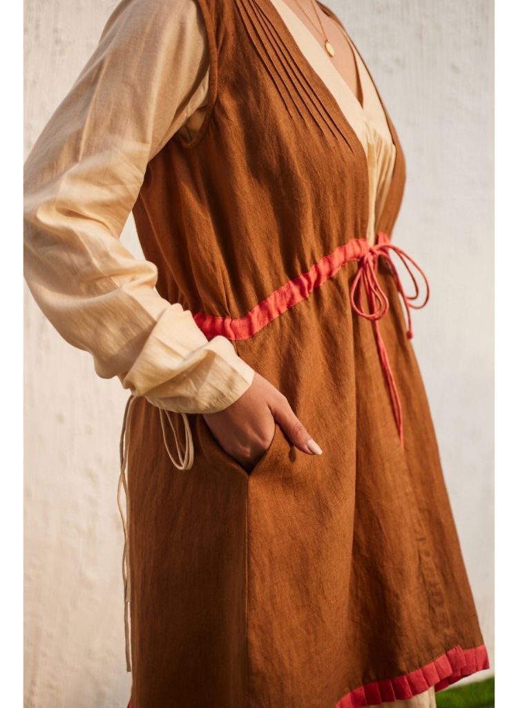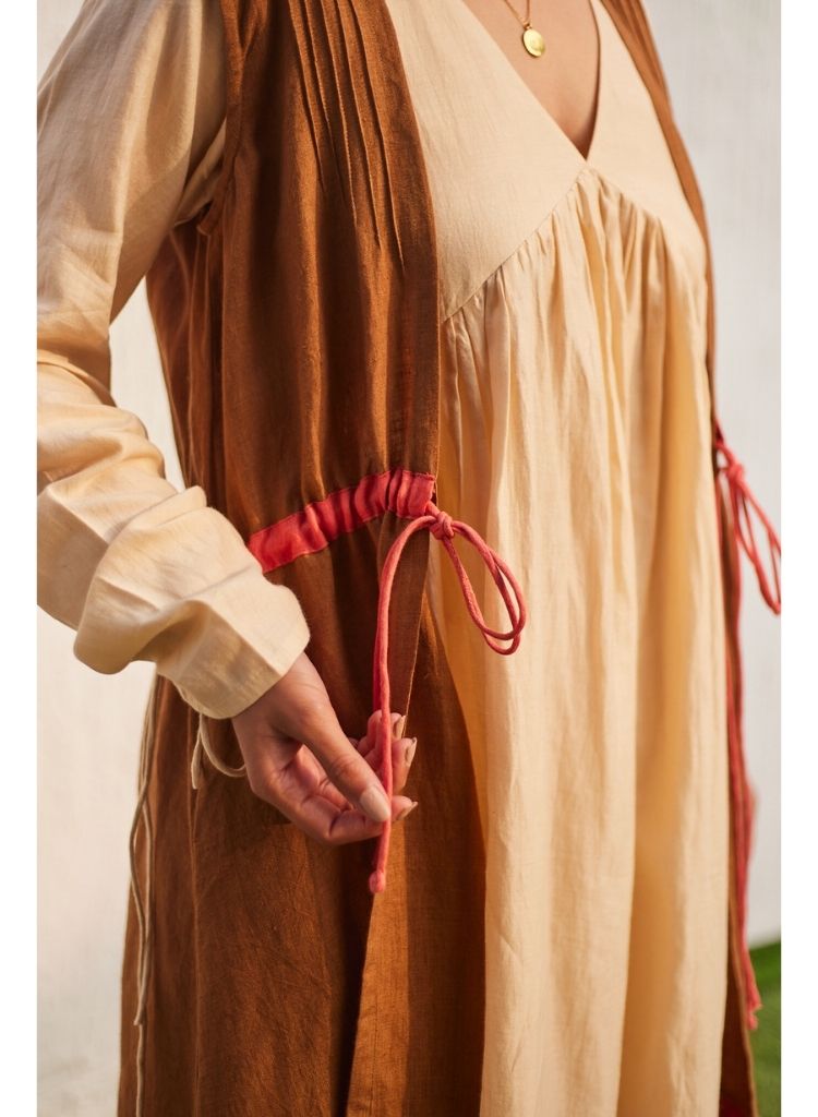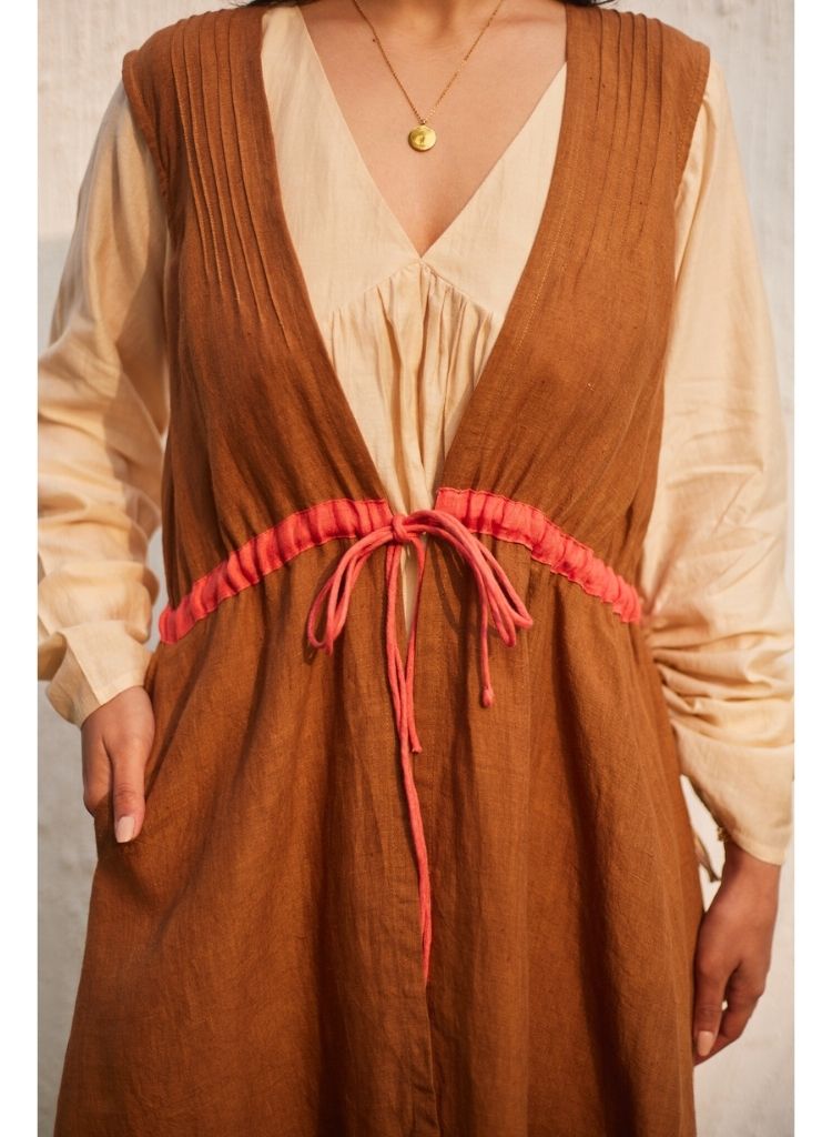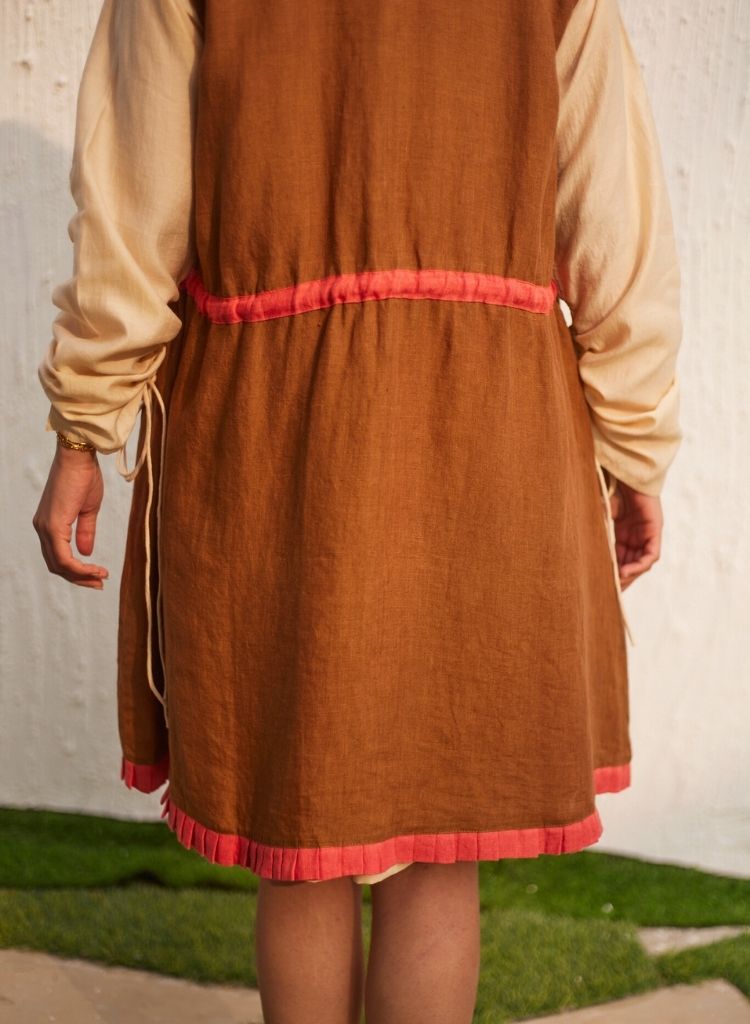 A sleeveless jacket with pintuck detail on the shoulder, contrasting pleats at the hem line and a contrasting adjustable drawstring waist featuring side pockets. Length 36". The model is 5'6" and is wearing size S.