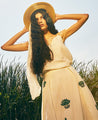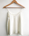 A simple cami top with a curved V-neck and spaghetti straps. Length 22". Made in 100% organic orange fiber cotton. The product displayed is a size S.