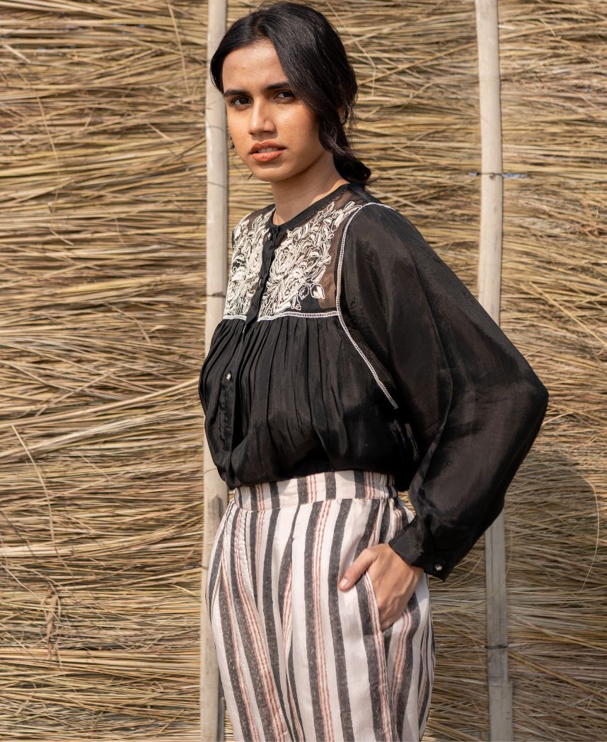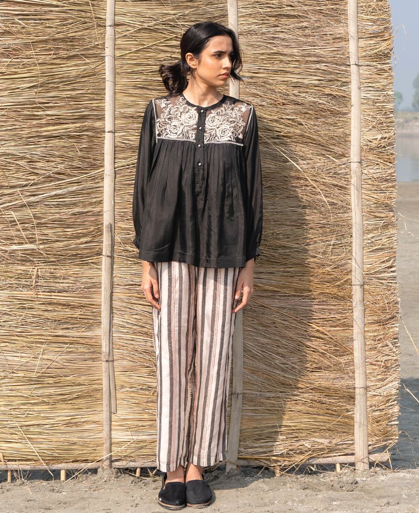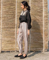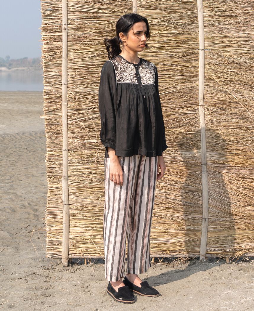 A pair of straight-fit pants featuring an organza hem detail and inseam pockets. Length 38". The model is 5'7" and is wearing a size S.