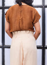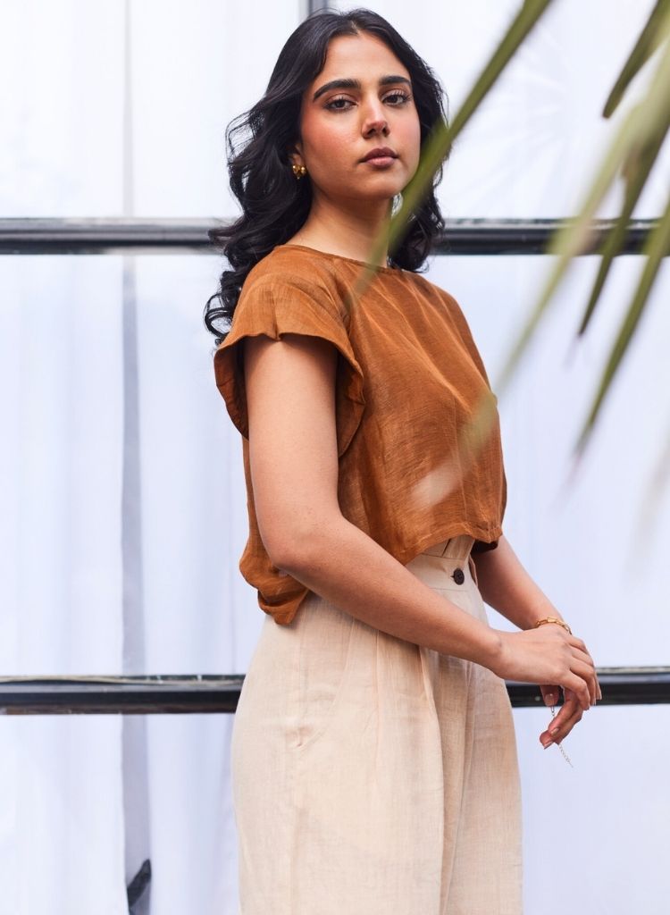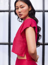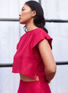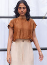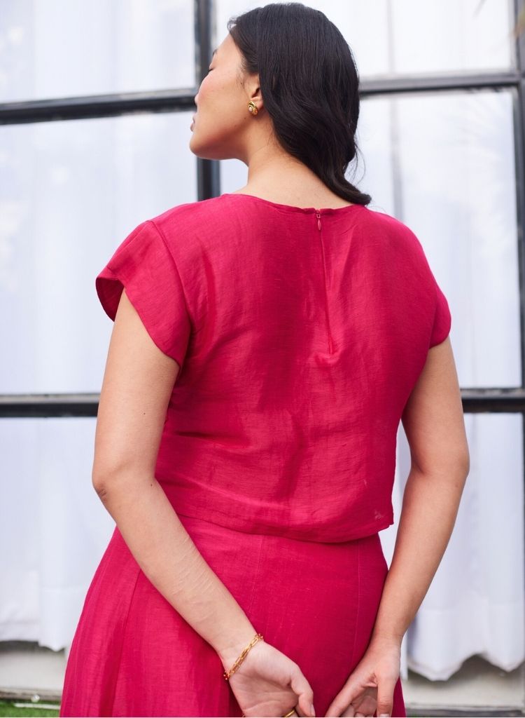 A crop top with drop shoulder, high-low hem, and small side slits featuring a round neck., short cap sleeves, and centre back concealed zipper fastening. Front length 17", back length 19.5".