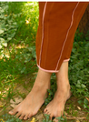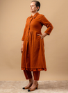 A two-piece set pairing the Carolle Shirt Dress and the Carolle Pants. The comfortable shirt dress with a bottom frill and hand-done embroidery along the collar, cuffs, and pockets features a full front opening, a one-piece collar, back pleats, and side pockets. Length 45". The elasticated panelled pants with contrast piping features side pockets. Length 36". The model is 5'5" and is wearing size M.