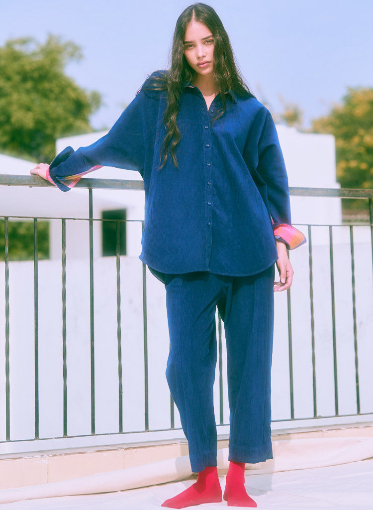 A pair of baggy fitting pants featuring a fixed waist, a zipper button closure, belt hoops and inseam pockets. Length 36". The model is 5'9" and is wearing a size S.