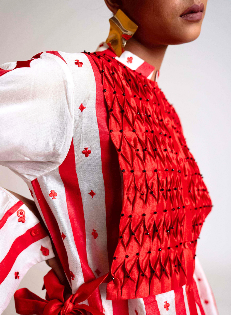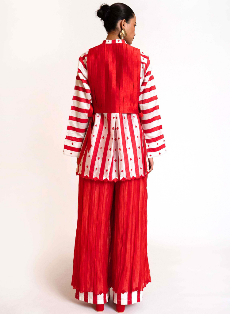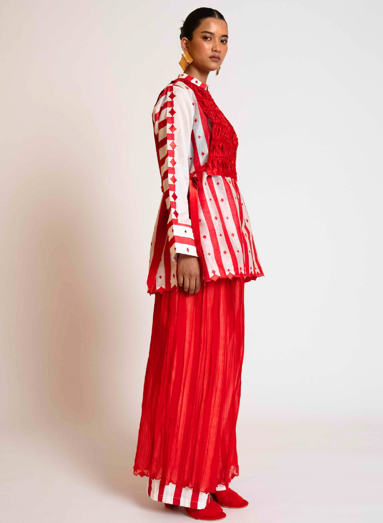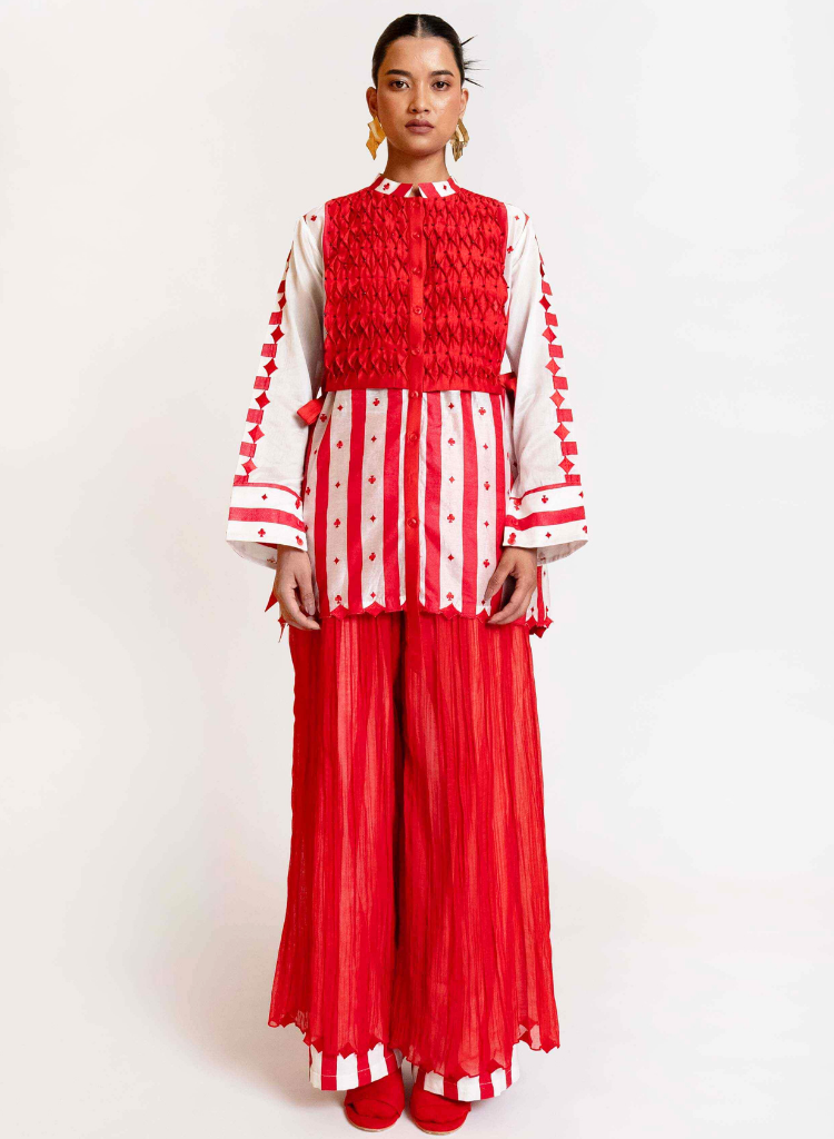 A two-piece set pairing statement striped shirt and matching pants. The striped shirt features an attached bib embellished with crystal beads and thread embroidery at hem and sleeves. Length 29"-30". The matching double layer pants feature a half elasticated waist. Length 41". The model is 5'6" and is wearing a size XS.