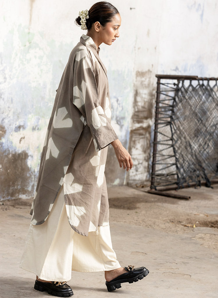 A relaxed-fitting tunic with Shibori print, a curved hem, and a collared V neckline featuring wide long sleeves, buttoned cuffs, and side welt pockets. Length 40". The model is 5'4" and is wearing a free size.