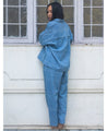 Tapered denim pants made in handspun handwoven cotton twill. Features side and back pockets, a zip fly and an elasticated back. Length 37-38" based on size. The model is 5'2" and is wearing a size S.